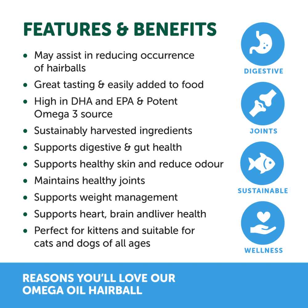 - Contains Salmon Oil, a rich source of Omega-3s, to support healthy skin, reduce odour, and minimise excess shedding