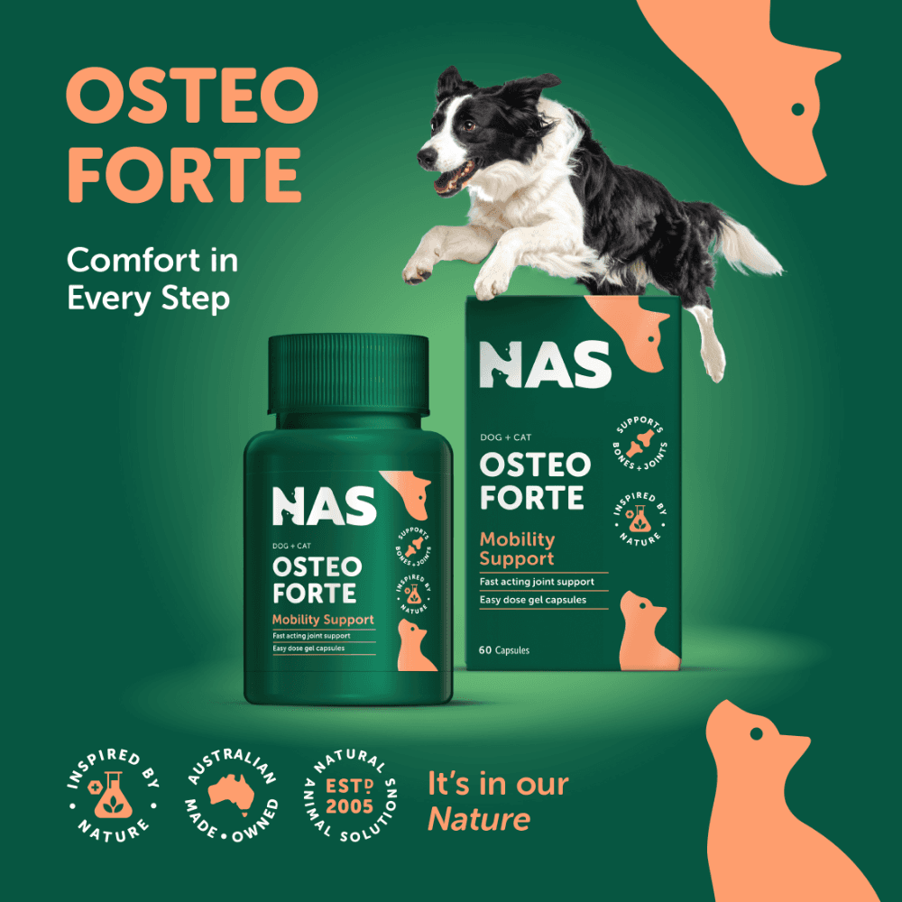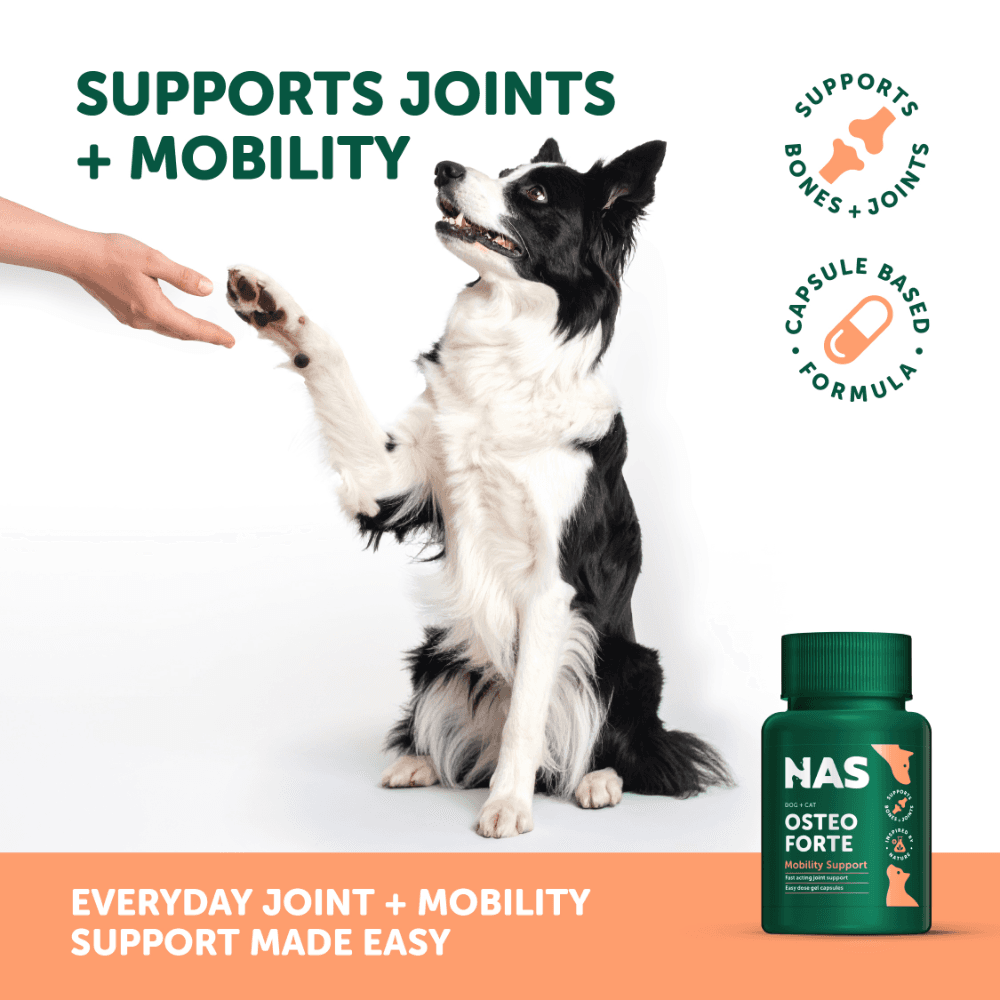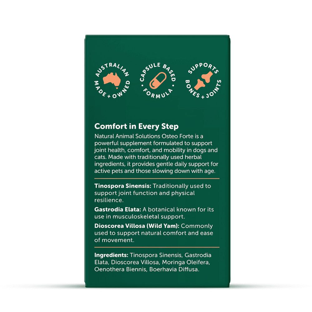 Natural Animal Solutions Osteoforte is a holistic, naturopathic formula designed to enhance joint health in cats and dogs. Patented to improve mobility, it helps ease joint discomfort, promoting overall comfort and flexibility for your pet.