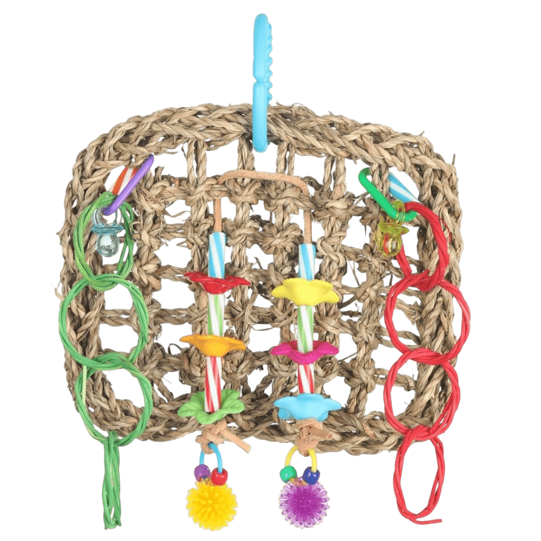 - Multi-Textured Enrichment: Combines a seagrass mat with vine rings, plastic beads, straws, pacifiers, and spiky balls for diverse tactile and chewing experiences.