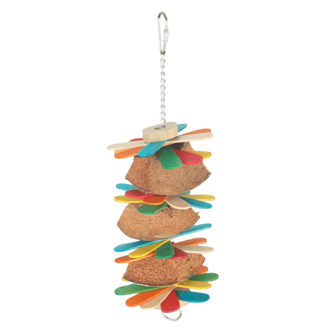 - Multi-Textured Engagement: Combines the intriguing texture of coconut husks for pecking and nibbling with sturdy popsicle sticks for climbing and perching.