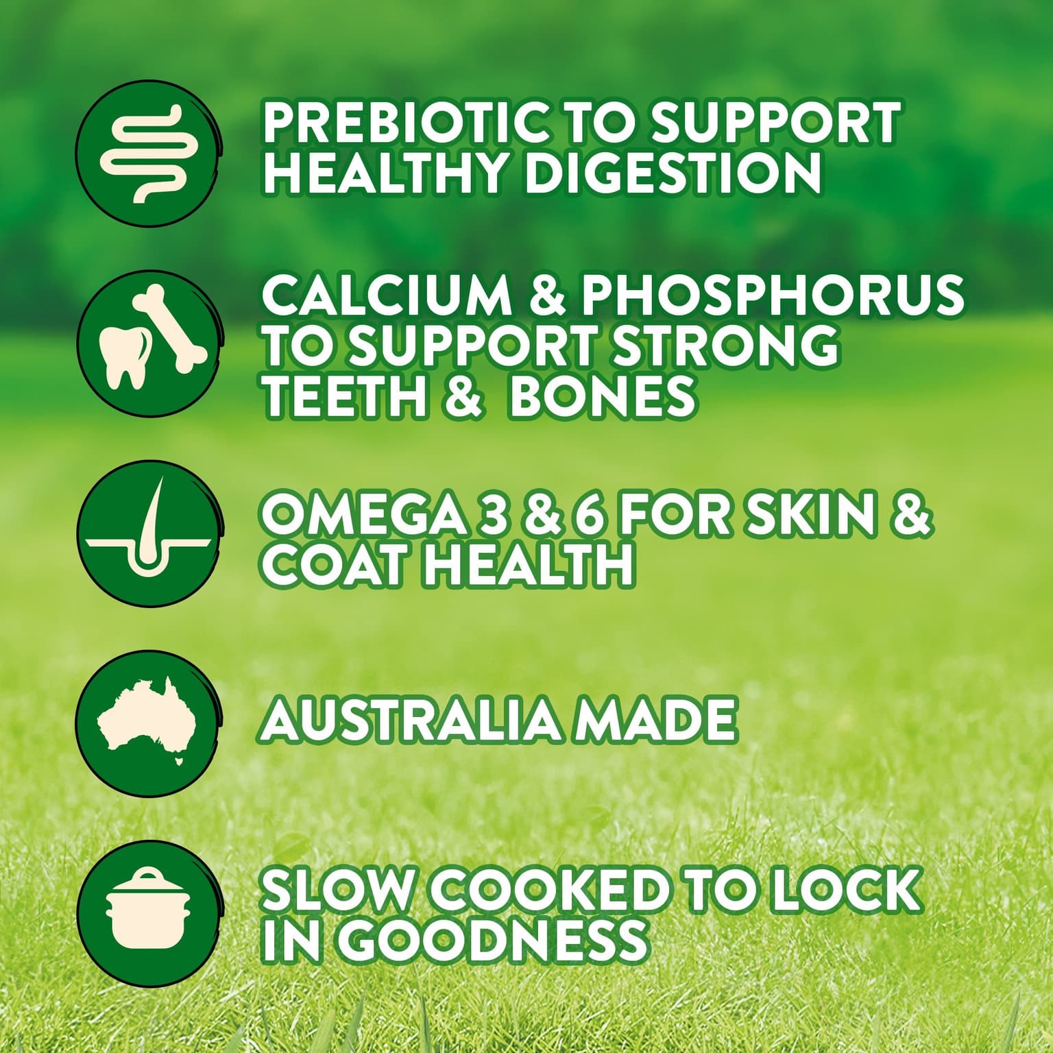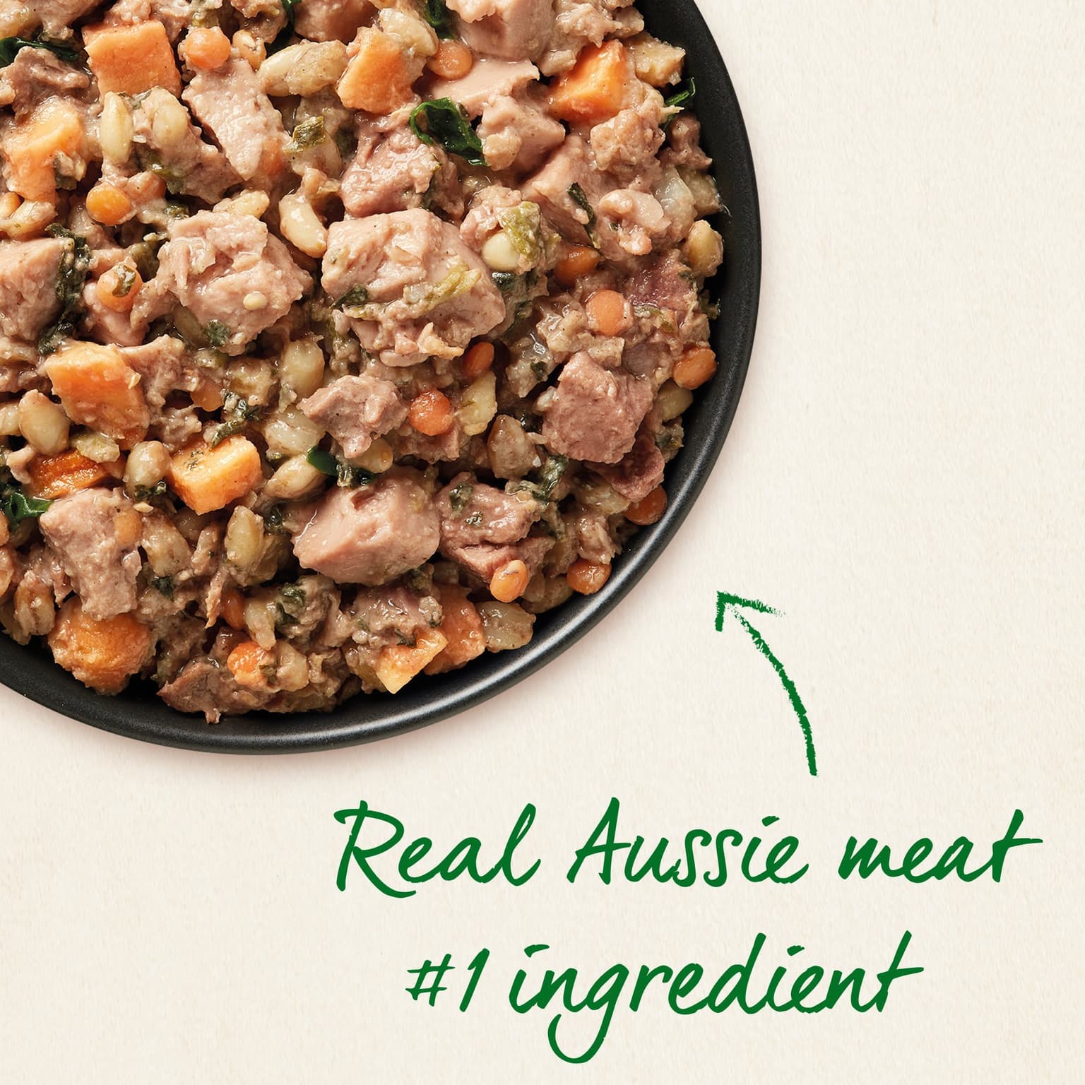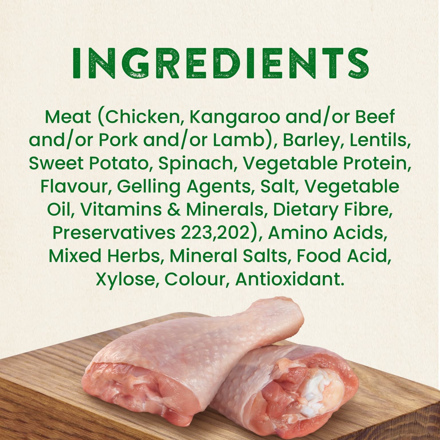 Meats (Chicken, Kangaroo and/or Beef and/or Pork and/or Lamb), Barley, Lentils, Sweet Potato, Spinach, Vegetable Protein, Flavour, Gelling Agents, Salt, Vegetable Oil, Vitamins & Minerals, Dietary Fibre, Preservatives (223, 202), Amino Acids, Mixed herbs, Mineral Salts, Food Acid, Xylose, Colour, Antioxidant.