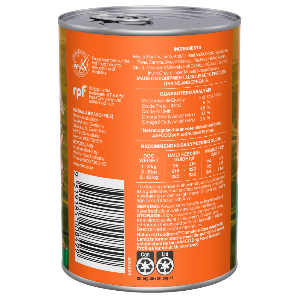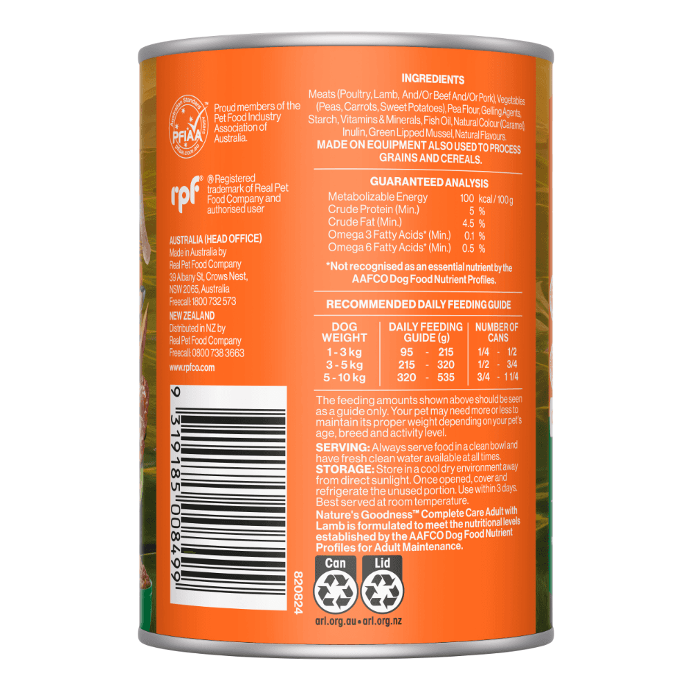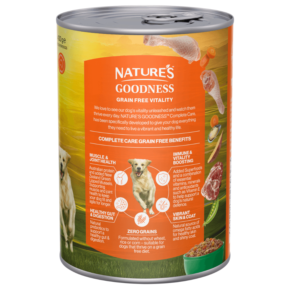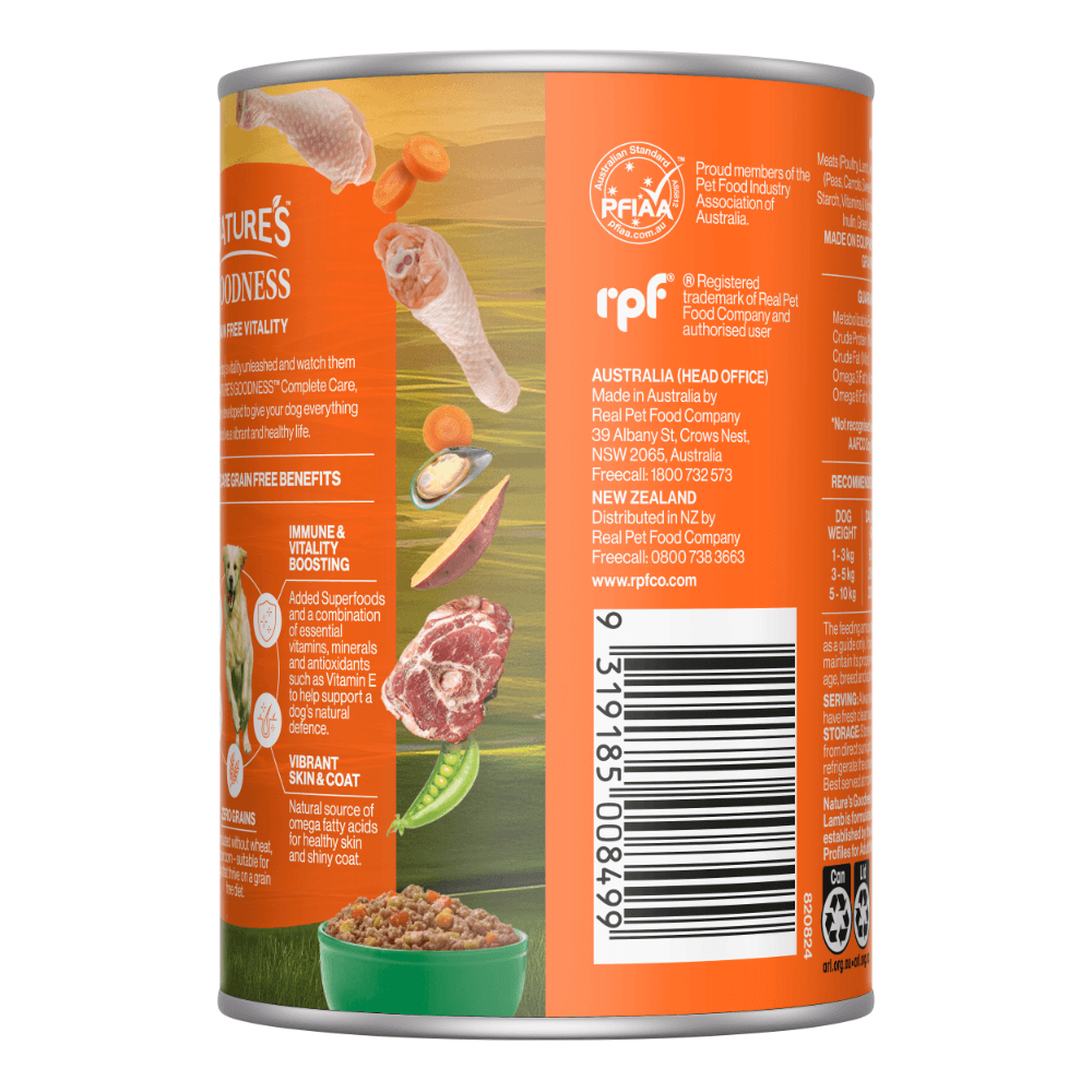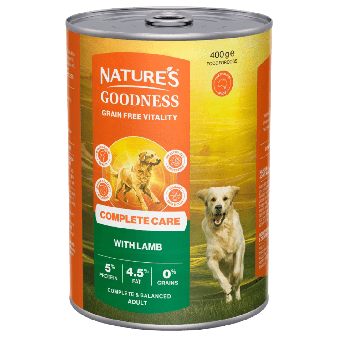 Natures Goodness Complete Care Lamb Adult Wet Dog Food is a grain-free Australian-made wet food formulated to provide adult dogs with complete nutrition and functional health benefits. Crafted with quality meats and natural ingredients, it delivers balanced support for joints, digestion, immunity, skin, and coat in every meal.