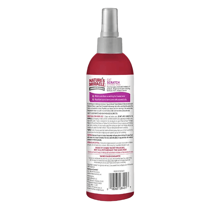 Nature's Miracle Advanced Platinum Cat Scratch Deterrent Spray is a targeted training solution designed to discourage your feline companion from engaging in destructive scratching on household surfaces. This advanced formula uses repellent scents to effectively steer cats away from furniture and textiles, helping to preserve your home environment while respecting their natural instincts.
