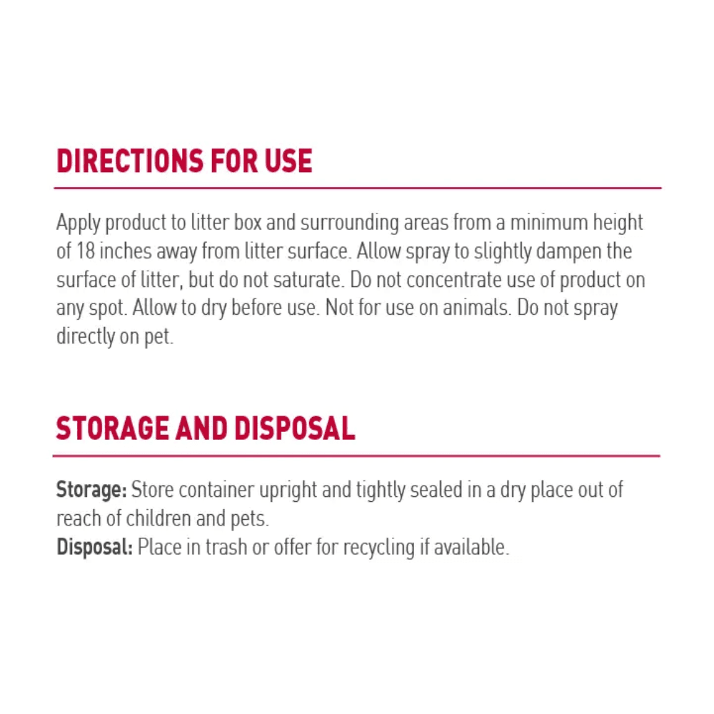 - A convenient spray application allows for targeted treatment of litter mats, hooded covers, and surrounding floor areas