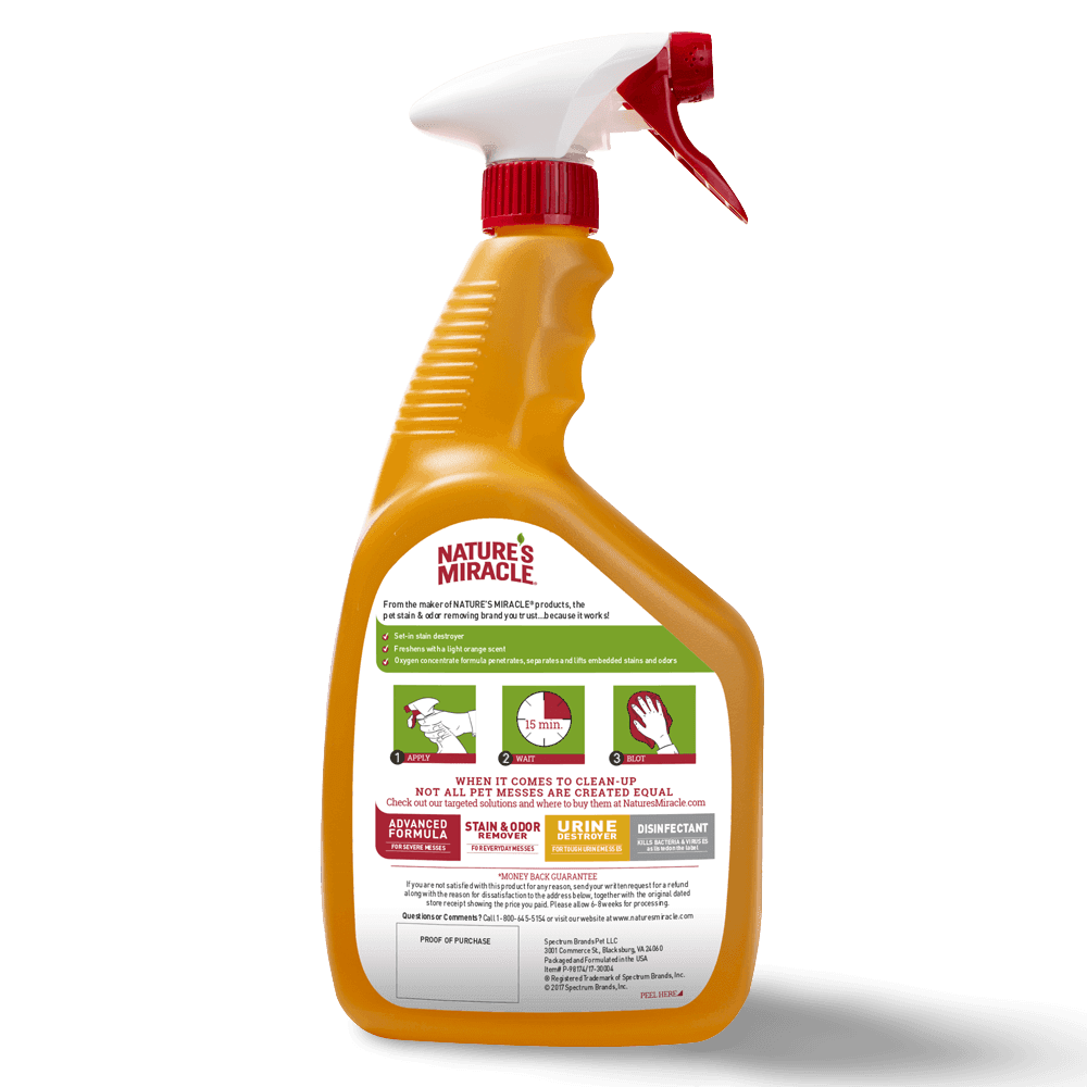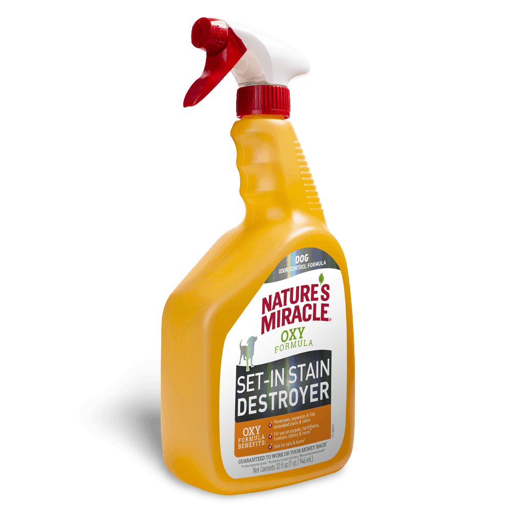 Tackle stubborn messes with Set In Stain Oxy Formula Dog Stain Destroyer. Nature's Miracle, a trusted expert for over 35 years, uses powerful oxygen-based formulas safe for pets and homes when used as directed. This specific spray lifts even deep-set dog stains from various surfaces.