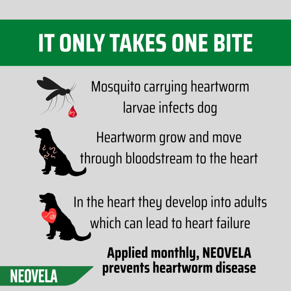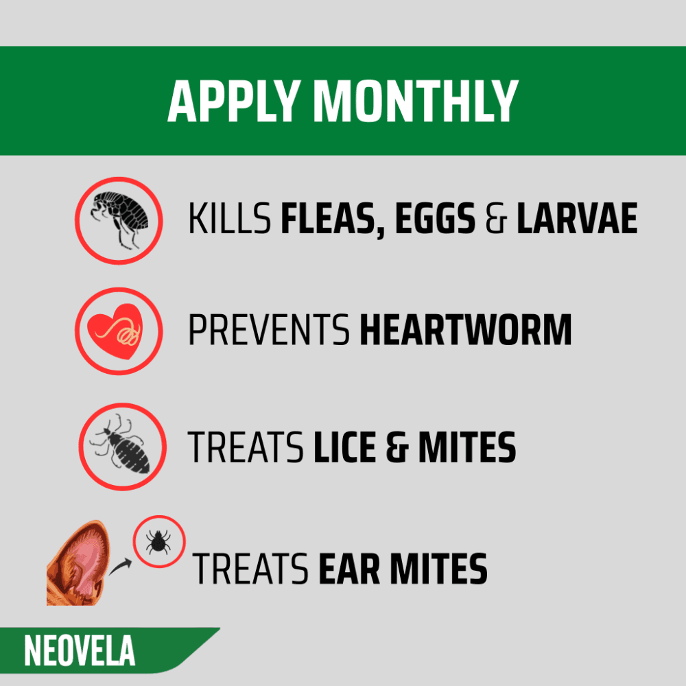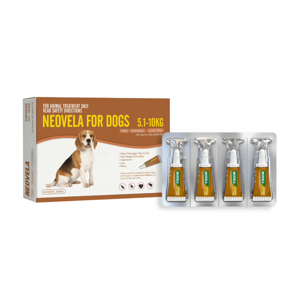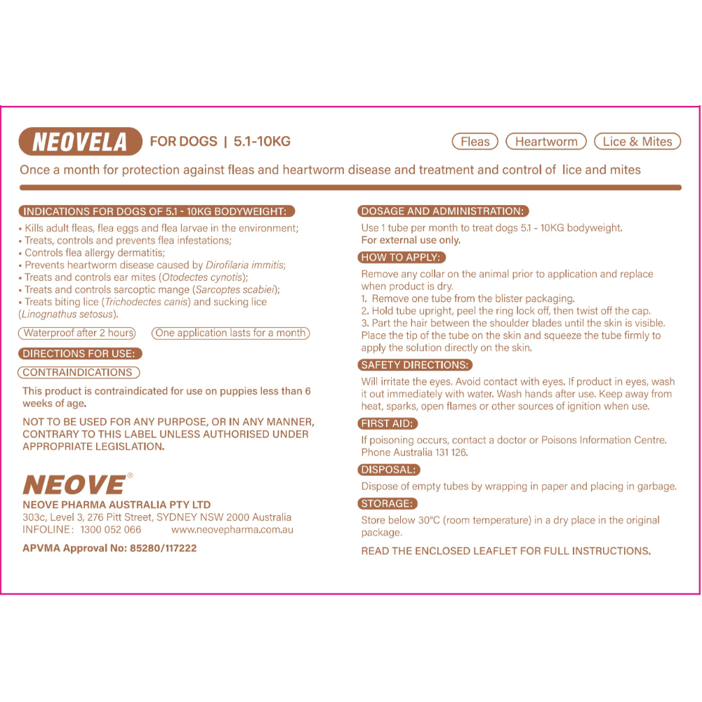 Neovela is an all-encompassing monthly spot-on treatment for dogs, providing key protection against fleas, mites, and heartworm, specifically designed for those weighing between 5.1-10kg.