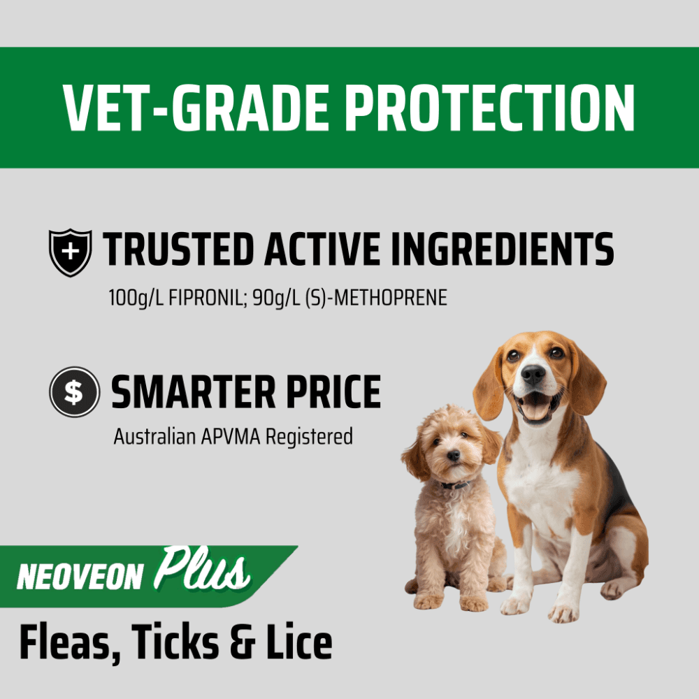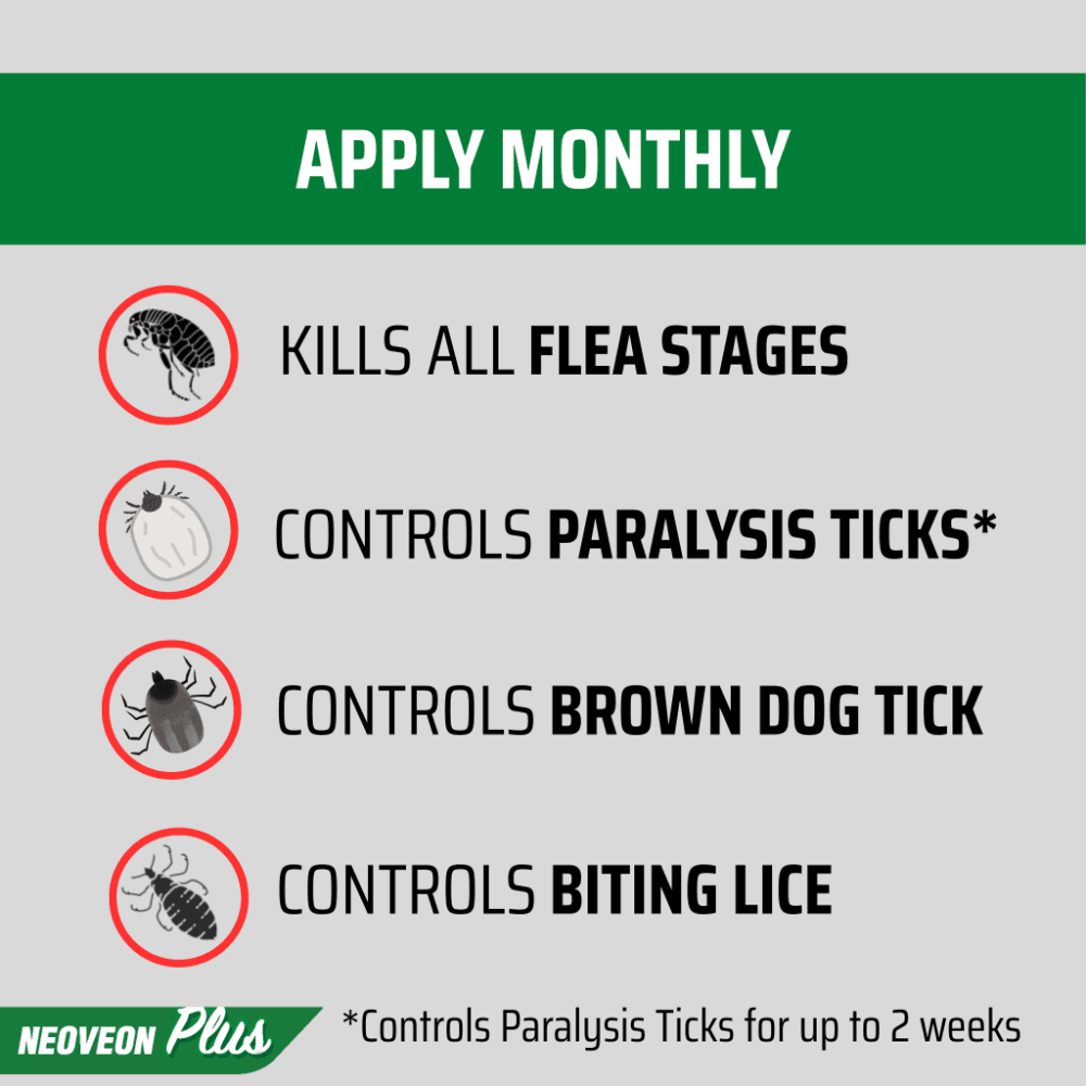 Neoveon Plus is a top-of-the-line flea and tick preventative measure, specifically formulated for medium-sized dogs. This spot-on treatment is simple to apply, offering reliable protection from fleas, lice, and ticks, including the Brown Dog Tick and the potentially dangerous Paralysis Tick.