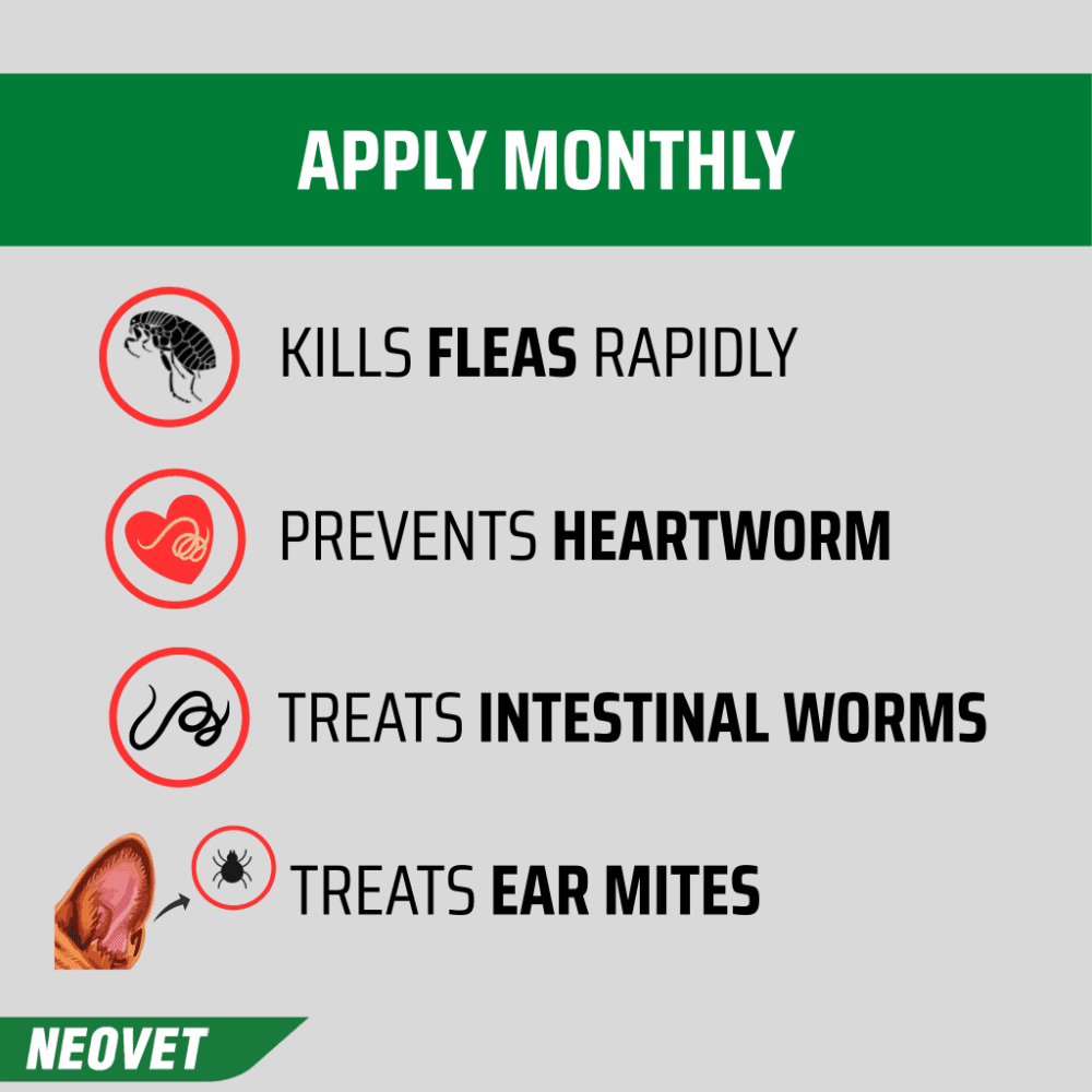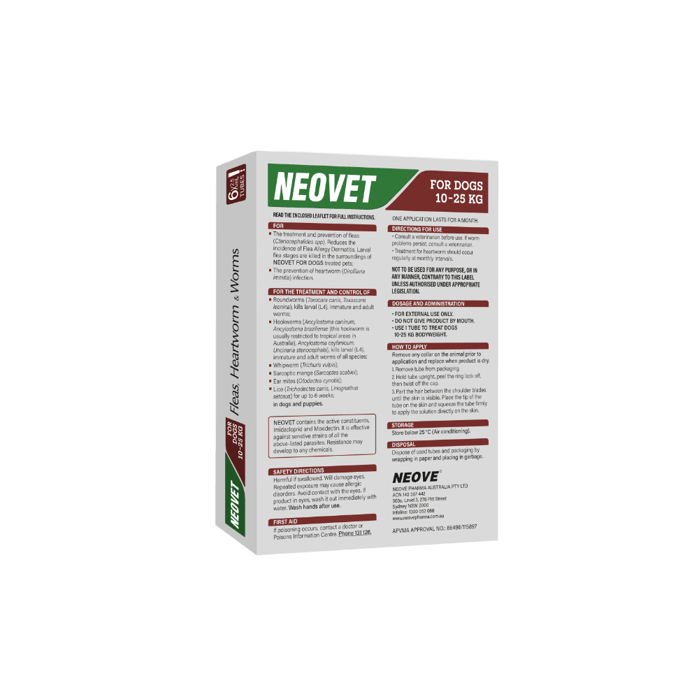 Neovet for Large Dogs is expertly formulated to provide a monthly barrier against a range of parasites for dogs weighing between 10 and 25kg. This spot-on treatment is both easy and convenient to administer, offering broad-spectrum coverage to ensure your canine companion stays healthy and parasite-free.