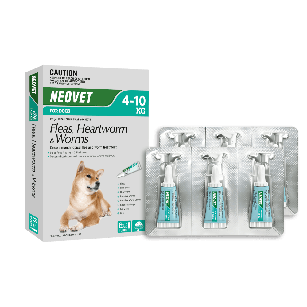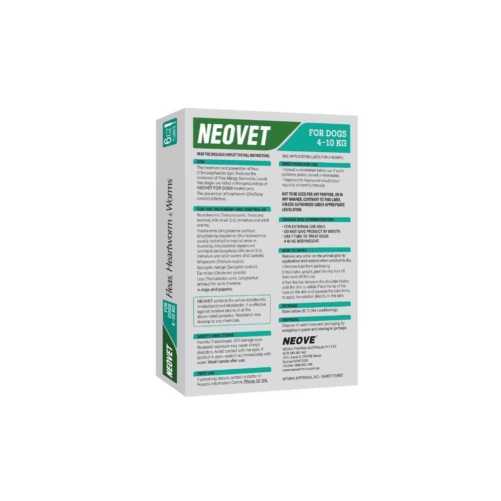 Neovet for Medium Dogs weighing 4 - 10kg is a comprehensive spot-on parasite protection solution, safeguarding your beloved canine friend from a variety of common parasites. Formulated for monthly use, its a vital part of your dogs preventative care routine to ensure they remain happy and healthy.