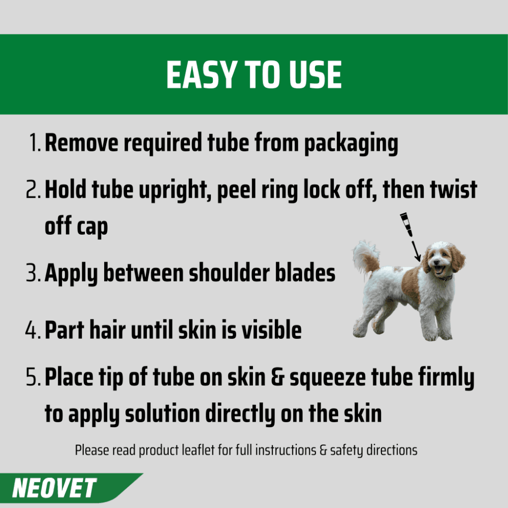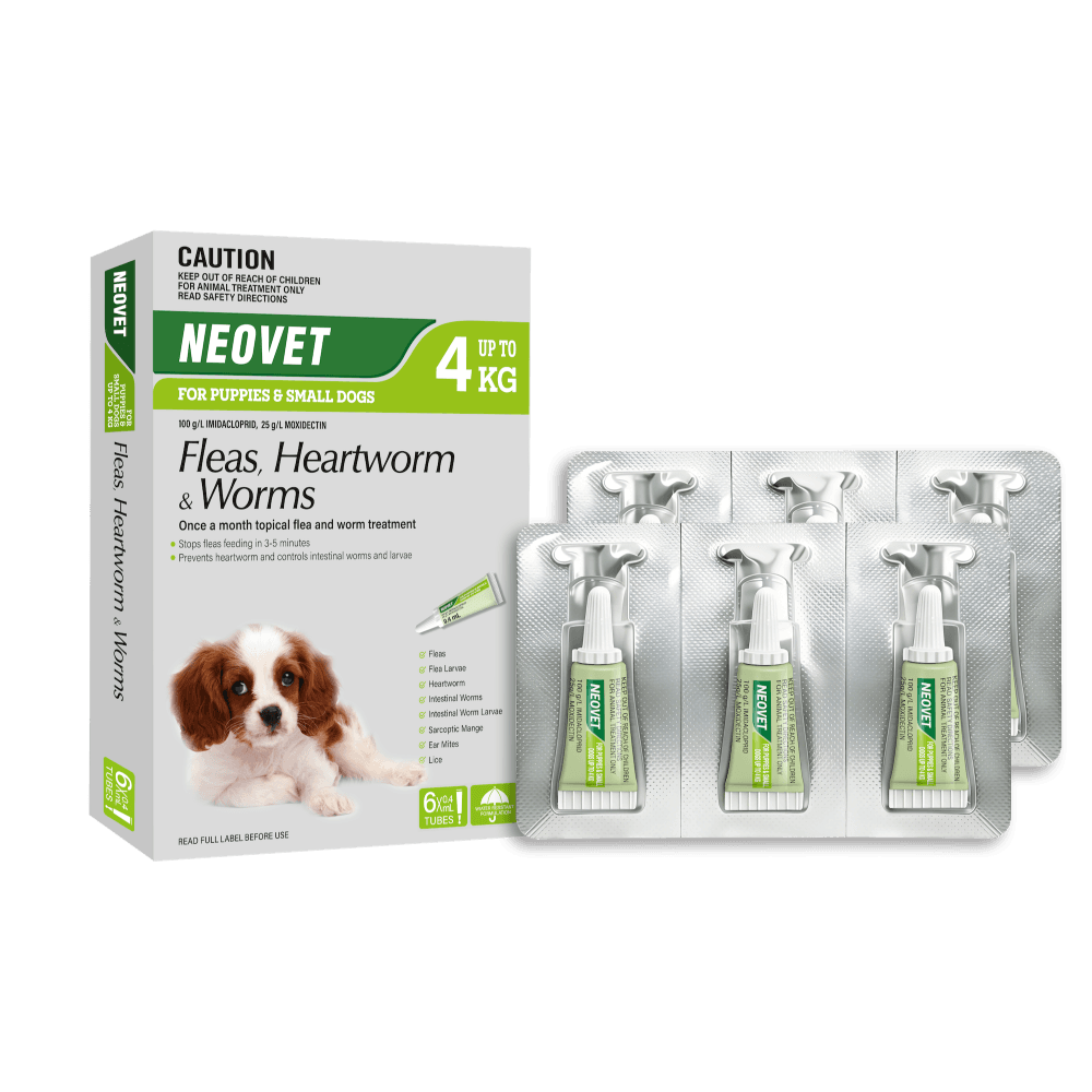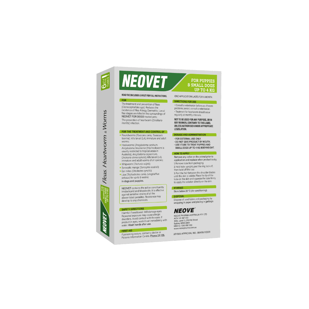 Neovet spot-on treatment offers a robust defense for small dogs up to 4kg against parasites like fleas and heartworm, ensuring comprehensive care tailored for smaller breeds.