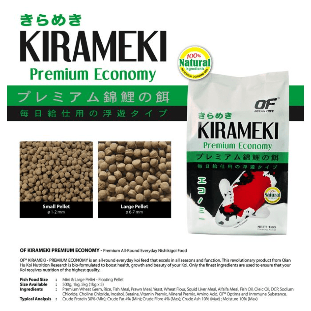 Wheat germ, rice, fish meal, prawn meal, yeast, wheat flour, and soy products, vitamins, minerals, and OF® Optima (a protein linker and metabolic enhancer)