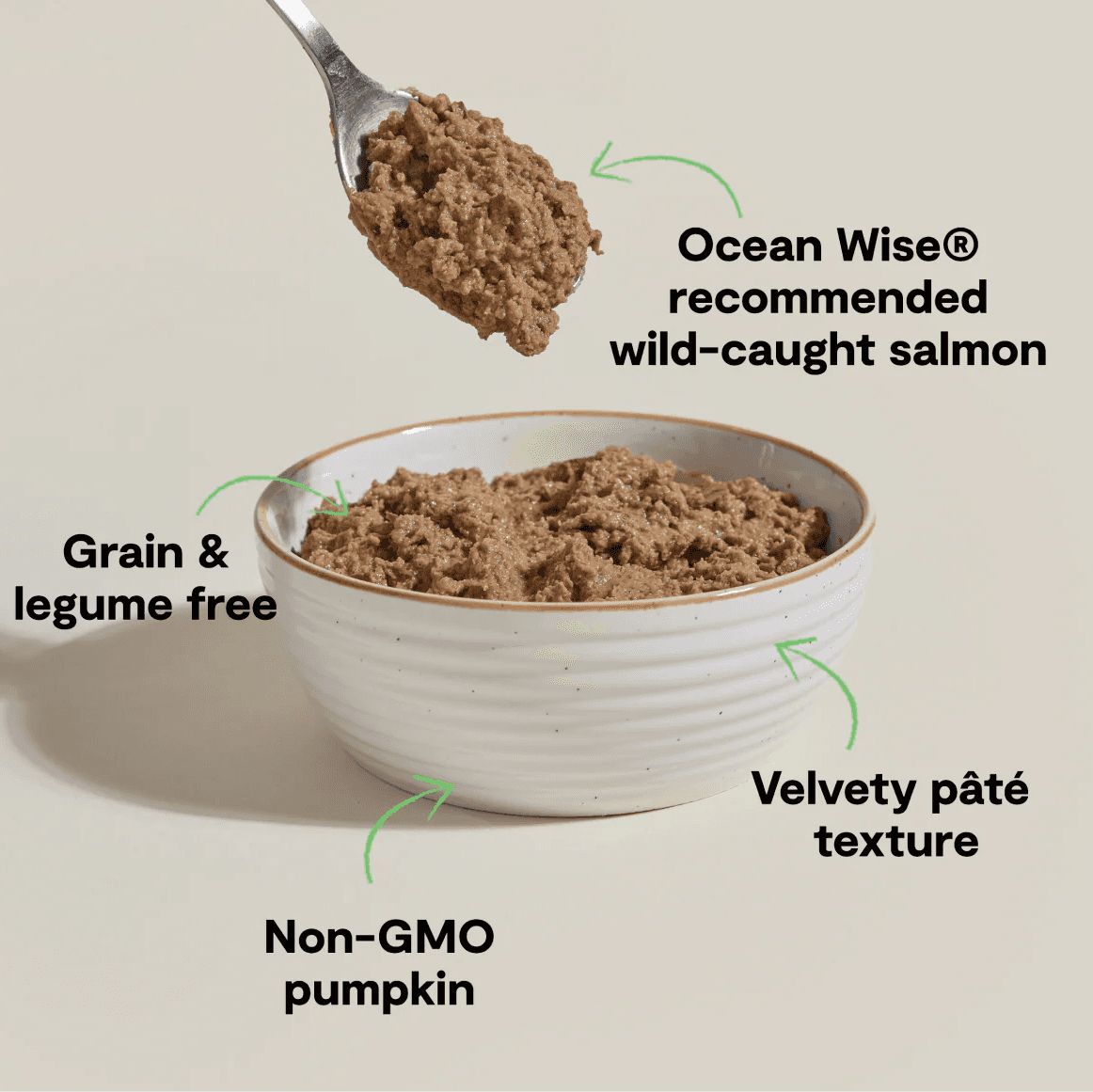 Salmon, Salmon Broth, Tapioca, Sunflower Oil, Pumpkin, Natural Flavor, Agar Agar, Calcium Carbonate, Parsley Potassium Chloride, Magnesium Sulfate, Taurine, Choline Chloride, Vitamins (Vitamin E Supplement, Vitamin A Supplement, Niacin Supplement, Pantothenic Acid, Riboflavin Supplement, Vitamin D3 Supplement, Thiamine Mononitrate, Vitamin B12 Supplement, Pyridoxine Hydrochloride, Folic Acid, Biotin), Minerals (Zinc Amino Acid Chelate, Iron Amino Acid Chelate, Copper Sulfate, Manganese Amino Acid Chelate, Sodium Selenite, Calcium Iodate)