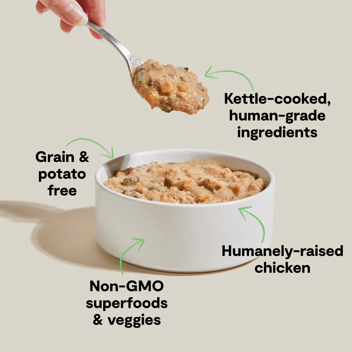 Humanely Raised Chicken, Chicken Bone Broth, Pumpkin, Carrots, Green Beans, Spinach, Red Lentils, Agar Agar, Garbanzo Beans (Chickpeas), Sunflower Oil, Coconut Oil (Preserved With Mixed Tocopherols), Chicory Root, Potassium Chloride, Salt, Vitamin A Supplement, Vitamin D3 Supplement, Vitamin E Supplement, D-Calcium Pantothenate, Thiamine Mononitrate, Riboflavin Supplement, Folic Acid, Vitamin B12 Supplement, Zinc Amino Acid Chelate, Iron Amino Acid Chelate, Copper Amino Acid Chelate, Manganese Amino Acid Chelate, Selenium Yeast, Choline Chloride, Dried Kelp, Turmeric, Cinnamon