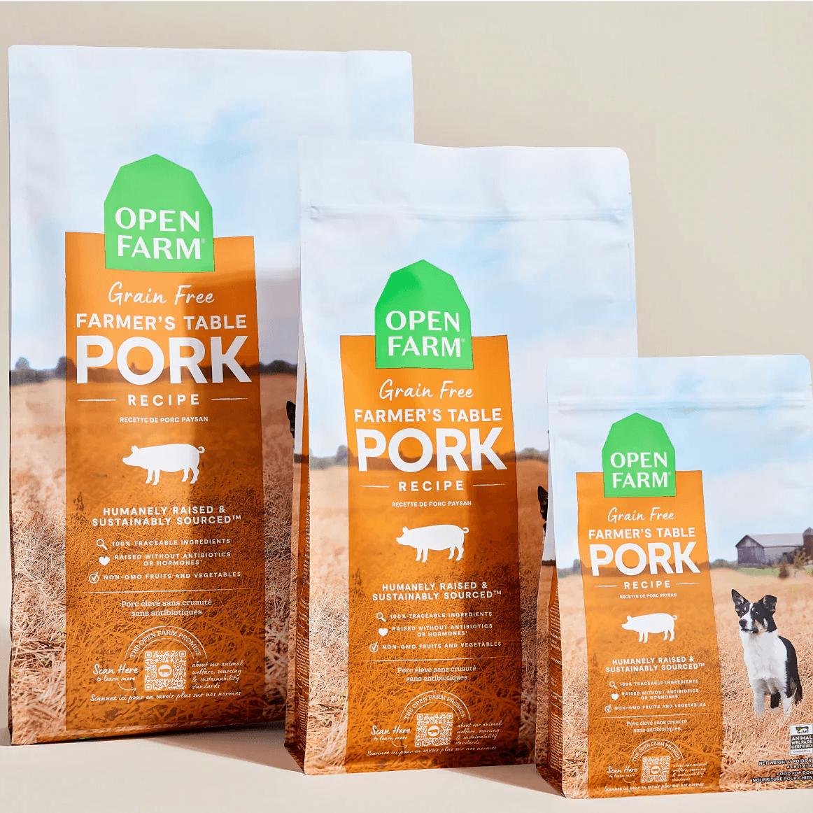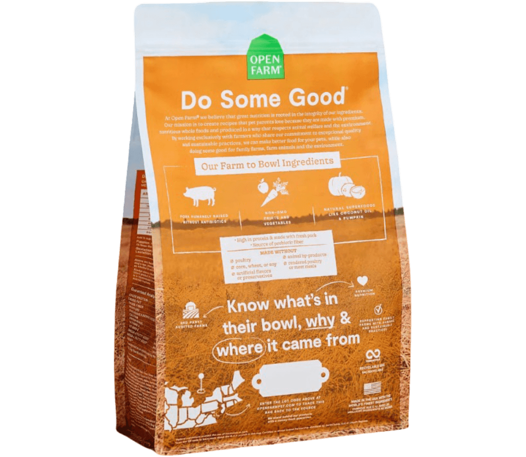Humanely Raised Pork, Garbanzo Beans (Chickpeas), Ocean Whitefish Meal, Field Peas, Green Lentils, Ocean Menhaden Fish Meal, Sweet Potato, Coconut Oil (preserved with mixed tocopherols), Tomato, Natural Flavour, Flaxseed, Sunflower Oil, Pumpkin, Squash, Beet Root, Carrots, Sun Cured Alfalfa, Chicory Root, Salmon Oil, Salt, Potassium Chloride, Dicalcium Phosphate, Mixed Tocopherols (a natural preservative), Vitamin E Supplement, Calcium Pantothenate, Niacin Supplement, Vitamin A Supplement, Riboflavin Supplement, Vitamin D3 Supplement, Vitamin B12 Supplement, Thiamine Mononitrate, Folic Acid, Choline Chloride, Zinc Proteinate, Calcium Carbonate, Iron Proteinate, Copper Proteinate, Manganese Proteinate, Selenium Yeast, Calcium Iodate, Rosemary Extract, Taurine, Cinnamon, Turmeric