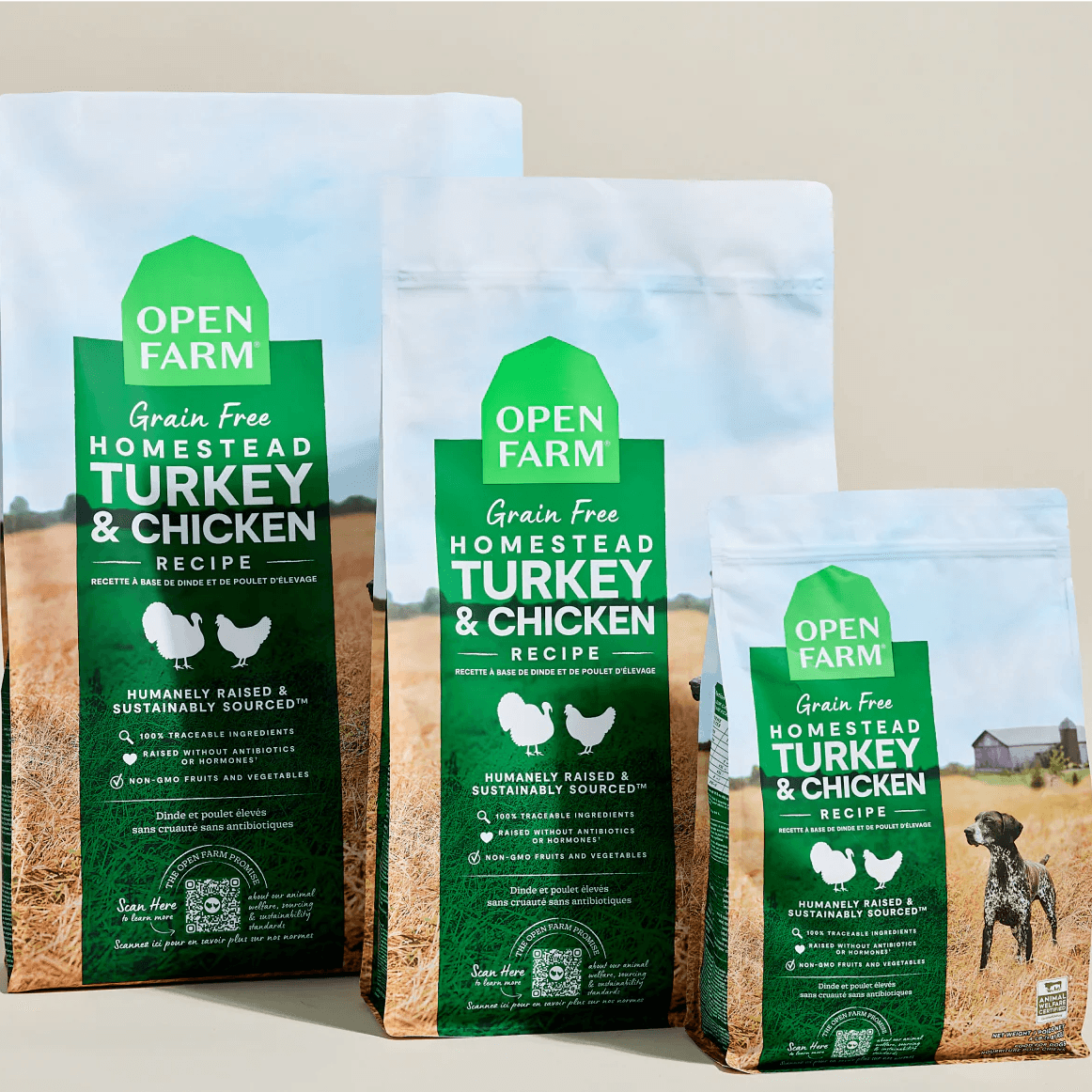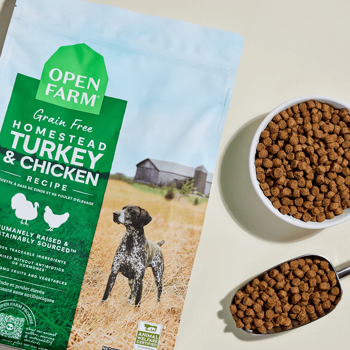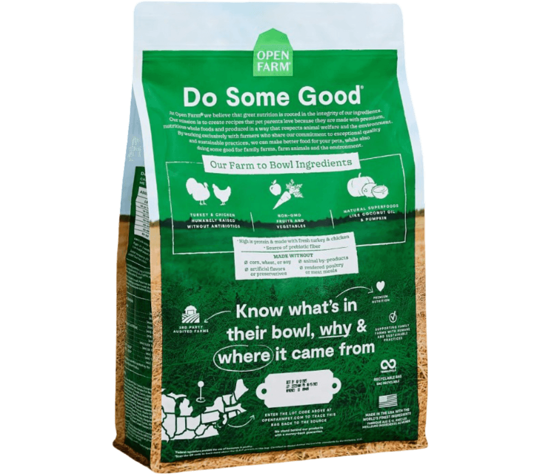 Open Farm Homestead Turkey & Chicken Grain-Free Dog Kibble is a premium dry dog food formulated to provide a nutritious and balanced diet for your canine companion. This grain-free recipe features a blend of humanely raised turkey and chicken as primary protein sources, ensuring high-quality nutrition. It's enriched with non-GMO fruits and vegetables such as pumpkin, carrots, and apples, along with superfoods like coconut oil, to support overall health. Free from corn, wheat, soy, and artificial additives, this kibble is suitable for dogs with dietary sensitivities.