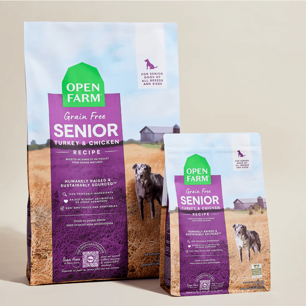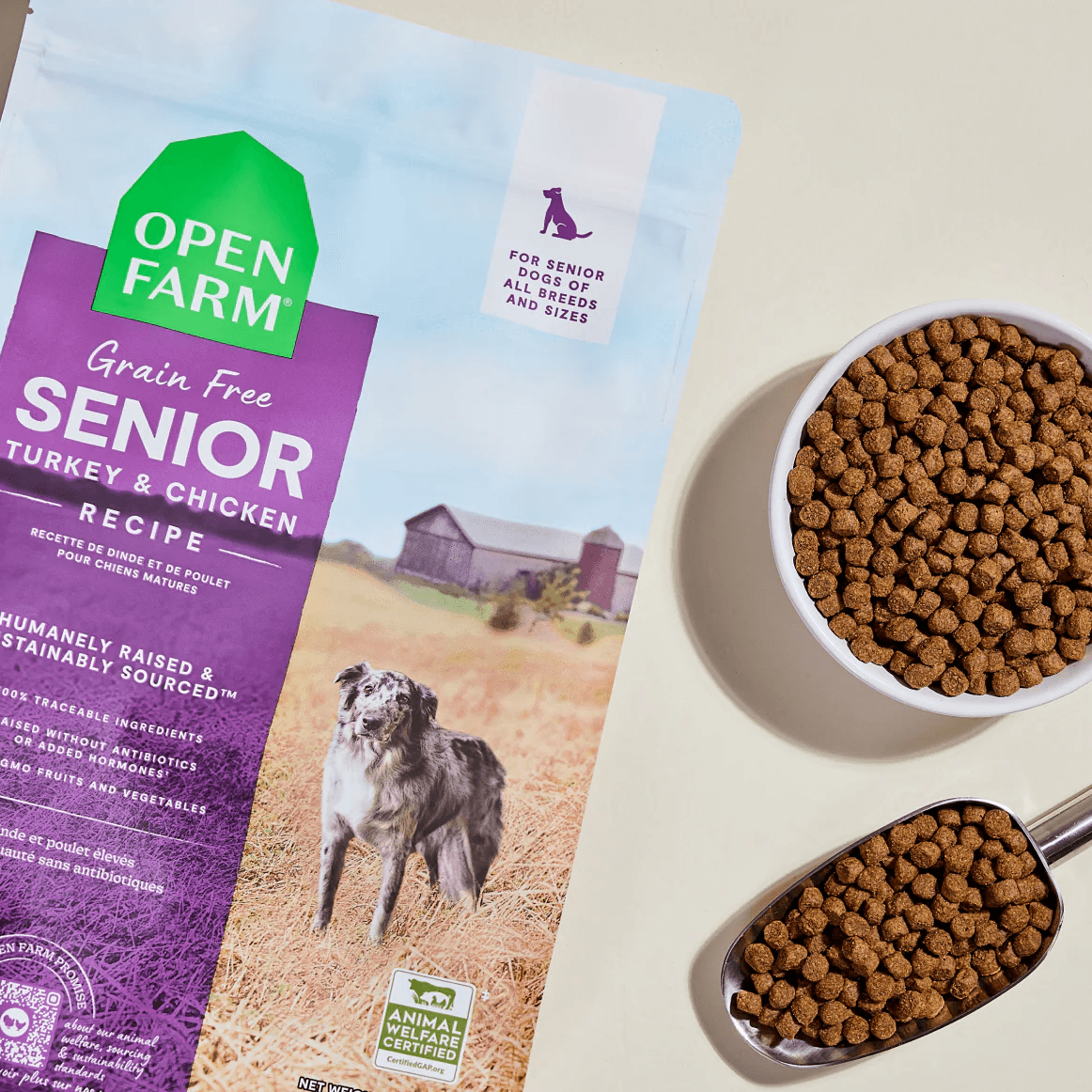 Open Farm Senior Grain-Free Dog Kibble is thoughtfully formulated to meet the unique nutritional needs of senior dogs, supporting their health and mobility as they age. This grain-free recipe combines humanely raised turkey and chicken, providing high-quality protein without antibiotics, hormones, or steroids. Enriched with functional ingredients like non-GMO pumpkin, sweet potato, coconut oil, and green-lipped mussel, it promotes joint health and overall well-being. Free from corn, wheat, soy, and artificial additives, this kibble is designed for the discerning senior dog.