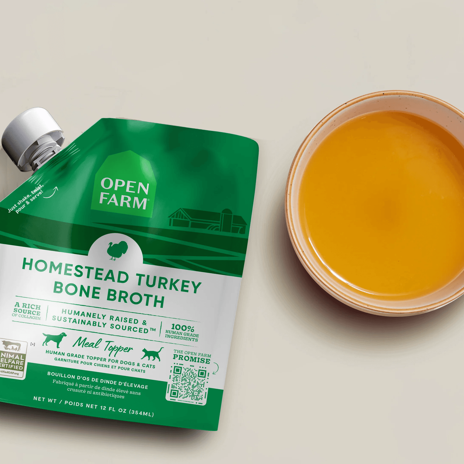 Open Farm's Homestead Turkey Bone Broth is a nutritious and flavorful addition to your pet's meals, suitable for both dogs and cats of all life stages. This collagen-rich broth is crafted from humanely raised turkey bones, simmered with non-GMO pumpkins and carrots, and infused with turmeric and parsley, providing essential nutrients to support your pet's overall health.