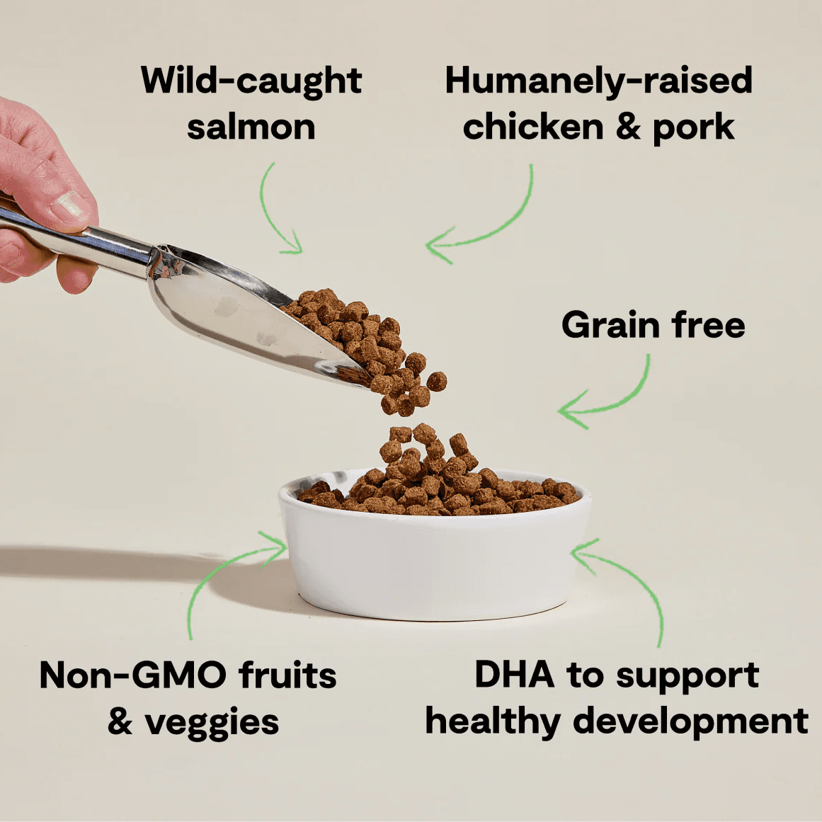 Humanely Raised Chicken, Wild Pacific Salmon, Ocean Whitefish Meal, Sweet Potato, Field Peas, Herring Meal, Humanely Raised Pork, Coconut Oil (Preserved With Mixed Tocopherols), Pumpkin, Coconut Meal, Garbanzo Beans (Chickpeas), Sunflower Oil, Red Lentils, Natural Flavour, Salmon Oil, Green Lentils, Cranberries, Chicory Root, Salt, Raspberries, Vitamin E Supplement, Calcium Pantothenate, Niacin Supplement, Vitamin A Supplement, Riboflavin Supplement, Vitamin D3 Supplement, Vitamin B12 Supplement, Thiamine Mononitrate, Folic Acid, Choline Chloride, Apples, Zinc Proteinate, Calcium Carbonate, Iron Proteinate, Copper Proteinate, Manganese Proteinate, Selenium Yeast, Calcium Iodate, Taurine, Turmeric, Mixed Tocopherols, Rosemary Extract, Potassium Chloride