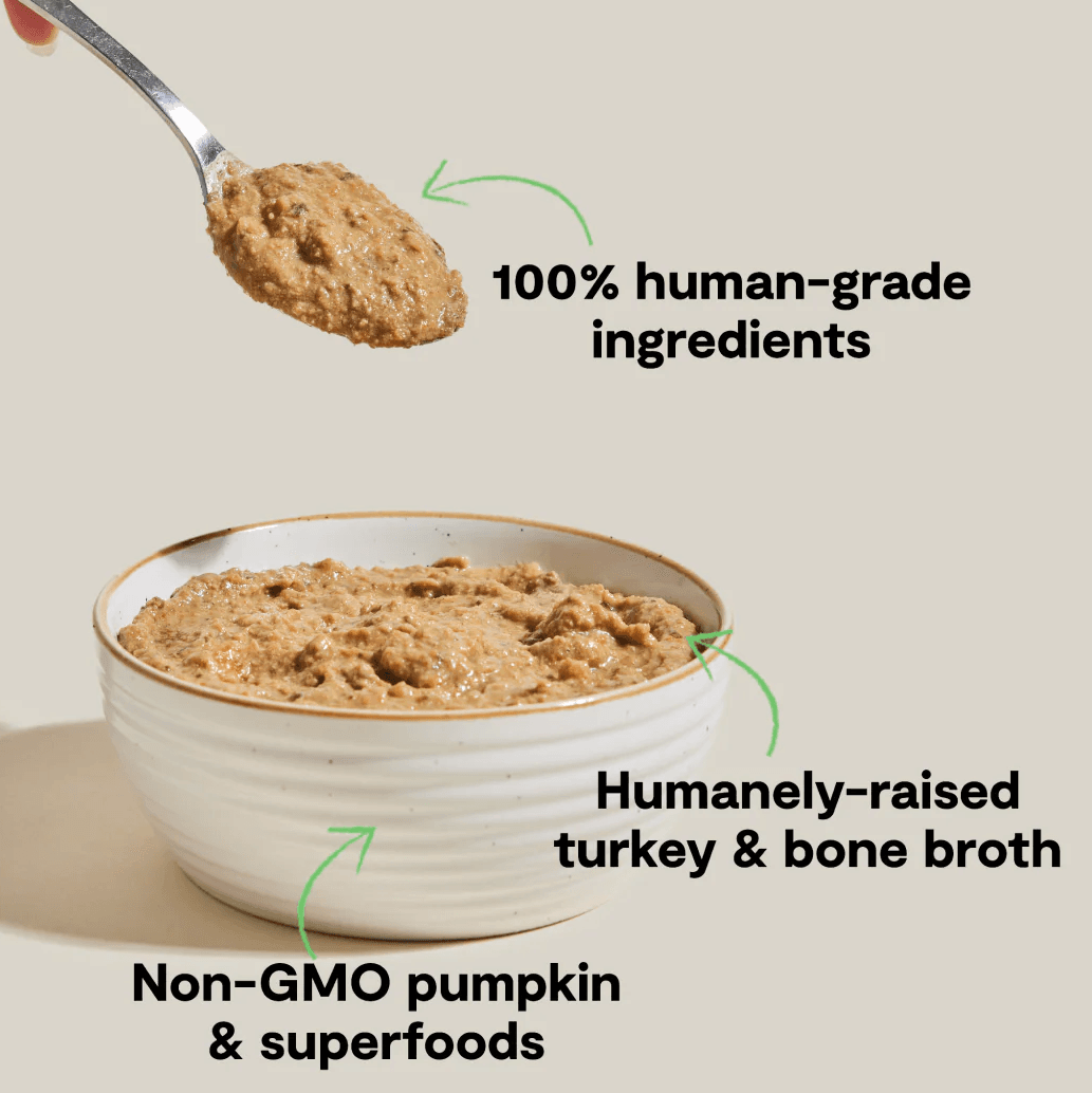 Humanely Raised Turkey, Turkey Bone Broth, Pumpkin, Carrots, Spinach, Red Lentils, Agar Agar, Non-GMO Cranberries, Garbanzo Beans (Chickpeas), Chicory Root, Sunflower Oil, Coconut Oil (preserved with mixed tocopherols), Salt, Vitamin A Supplement, Vitamin D3 Supplement, Vitamin E Supplement, D-calcium Pantothenate, Thiamine Mononitrate, Riboflavin Supplement, Biotin, Folic Acid, Vitamin B12 Supplement, Zinc Amino Acid Chelate, Iron Amino Acid Chelate, Copper Amino Acid Chelate, Manganese Amino Acid Chelate, Sodium Selenite, Dried Kelp, Potassium Chloride, Dandelion Greens, Choline Chloride, Taurine, Turmeric