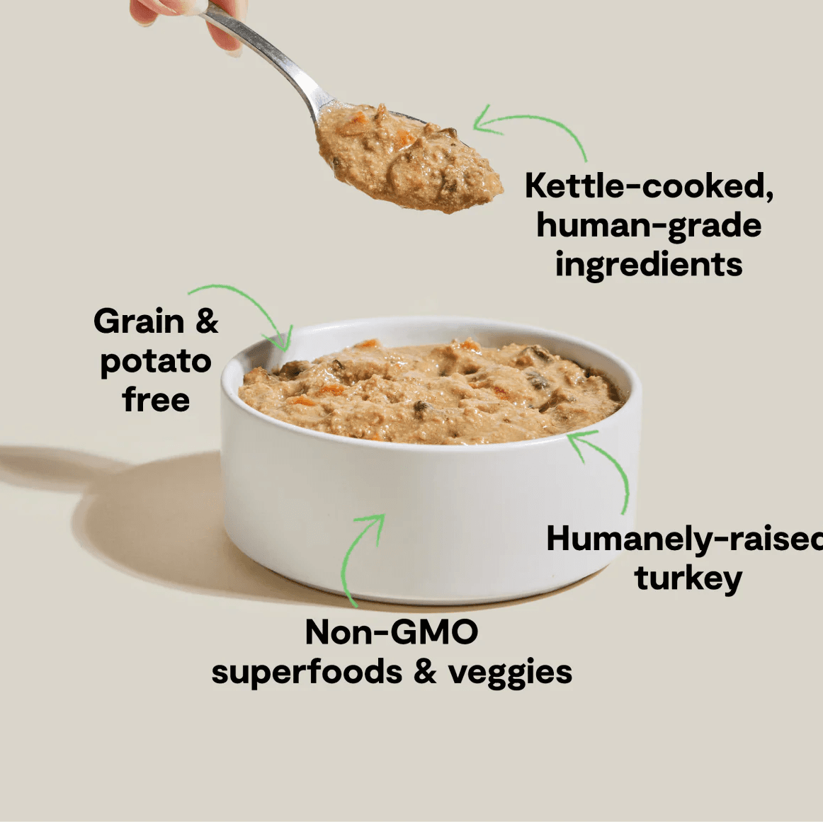 Humanely Raised Turkey, Turkey Bone Broth, Pumpkin, Carrots, Green Beans, Spinach, Red Lentils, Agar Agar, Garbanzo Beans (Chickpeas), Sunflower Oil, Coconut Oil (preserved with mixed tocopherols), Chicory Root, Salt, Potassium Chloride, Vitamin A Supplement, Vitamin D3 Supplement, Vitamin E Supplement, D-calcium Pantothenate, Thiamine Mononitrate, Riboflavin Supplement, Folic Acid, Vitamin B12 Supplement, Zinc Amino Acid Chelate, Iron Amino Acid Chelate, Copper Amino Acid Chelate, Manganese Amino Acid Chelate, Selenium, Yeast, Dried Kelp, Turmeric, Cinnamon