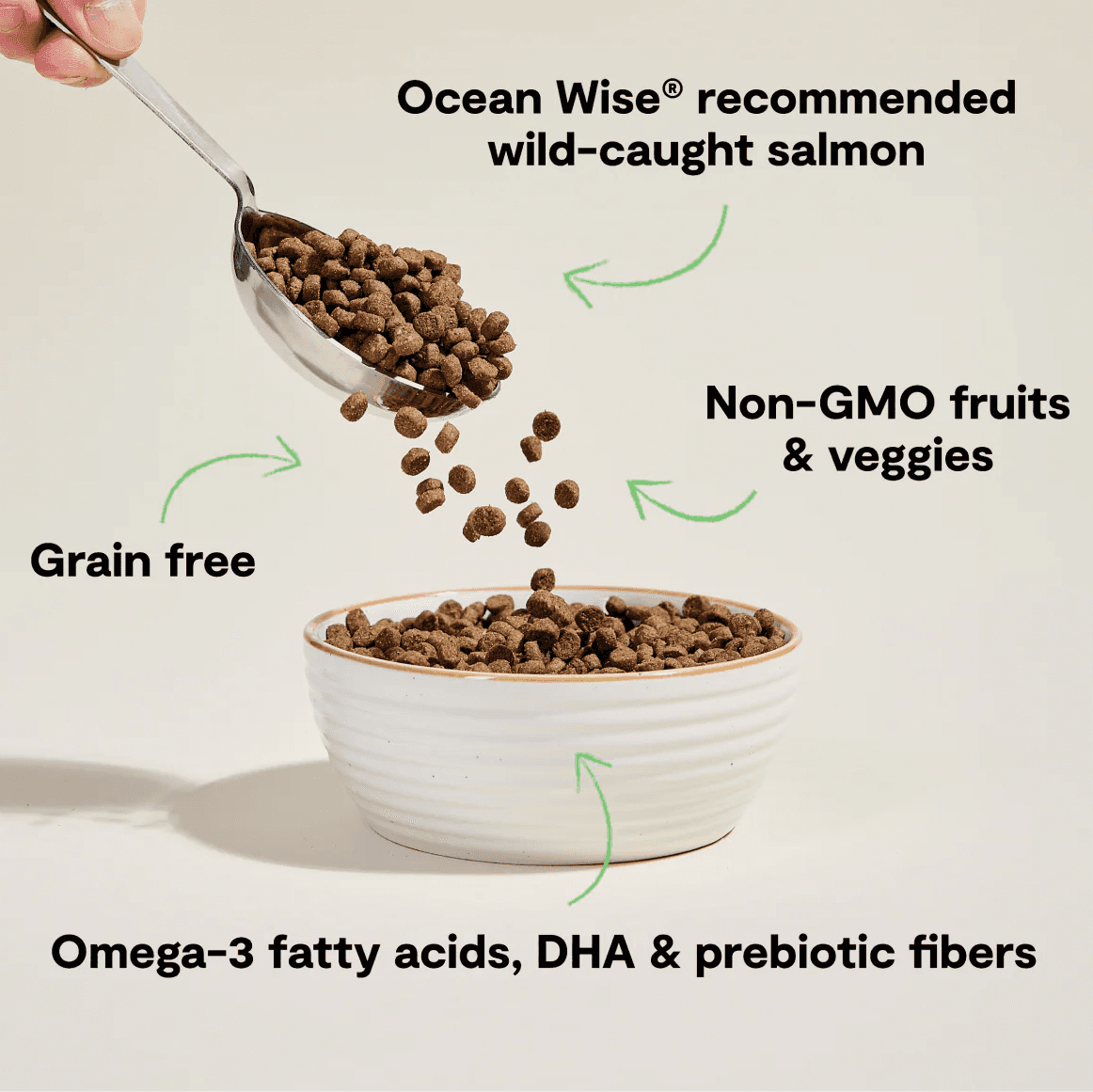 Wild Pacific Salmon, Ocean Whitefish Meal, Ocean Herring Meal, Garbanzo Beans (Chickpeas), Red Lentils, Coconut Oil (preserved with mixed tocopherols), Herring Oil (preserved with mixed tocopherols), Pumpkin, Natural Flavour, Green Lentils, Salmon Oil, Non-GMO Cranberries, Chicory Root, Apples, Dandelion Greens, Choline Chloride, Salt, Turmeric, Dried Yucca Schidigera Extract, Potassium Chloride, Mixed Tocopherols (a natural preservative), Calcium Carbonate, Zinc Proteinate, Iron Proteinate, Copper Proteinate, Manganese Proteinate, Sodium Selenite, Calcium Iodate, Vitamin E Supplement, Thiamine Mononitrate, Niacin Supplement, D-calcium Pantothenate, Biotin, Vitamin A Acetate, Riboflavin , upplement, Vitamin B12 Supplement, Vitamin D3 Supplement, Folic Acid, Taurine, Rosemary Extract
