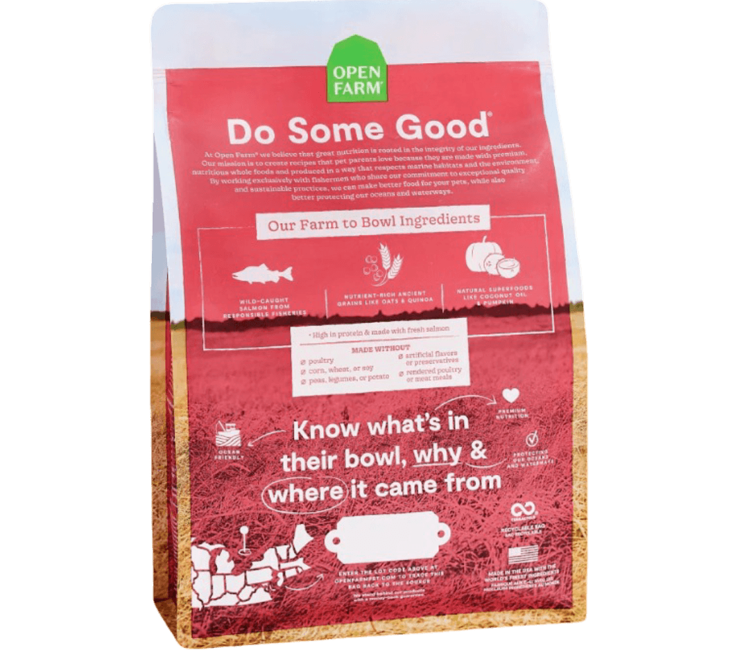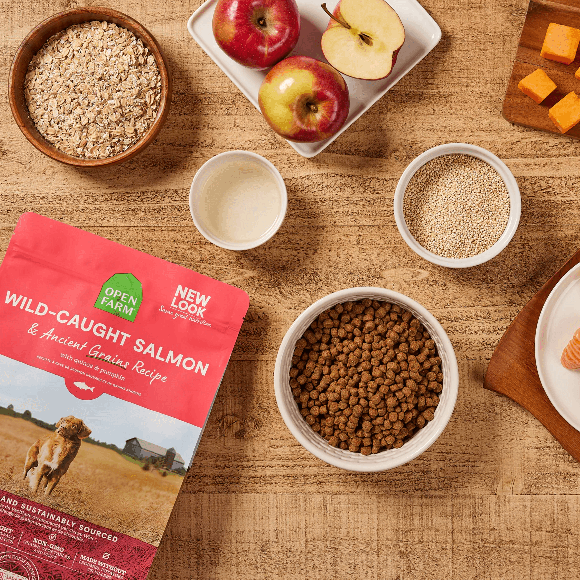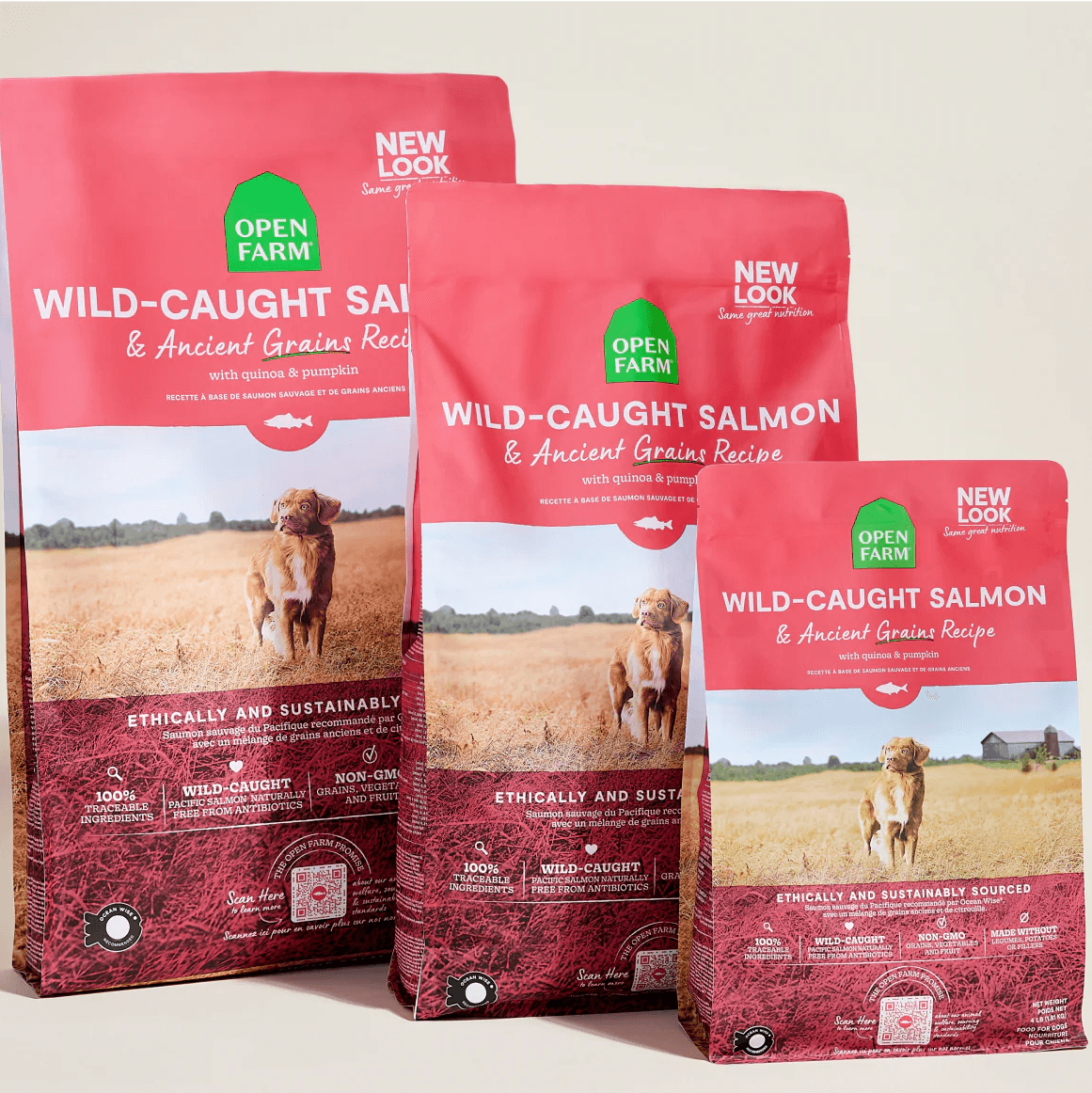 Open Farm Wild-Caught Salmon and Ancient Grains Dry Dog Food is a premium dog food that combines wild-caught salmon with nutrient-rich ancient grains to offer a well-balanced meal for your dog. Designed to provide high-quality protein and essential nutrients, this formula is perfect for maintaining a healthy coat, skin, and overall well-being. With its blend of ethically sourced ingredients and superior nutrition, it's a great choice for health-conscious pet owners looking to give their dogs the best.