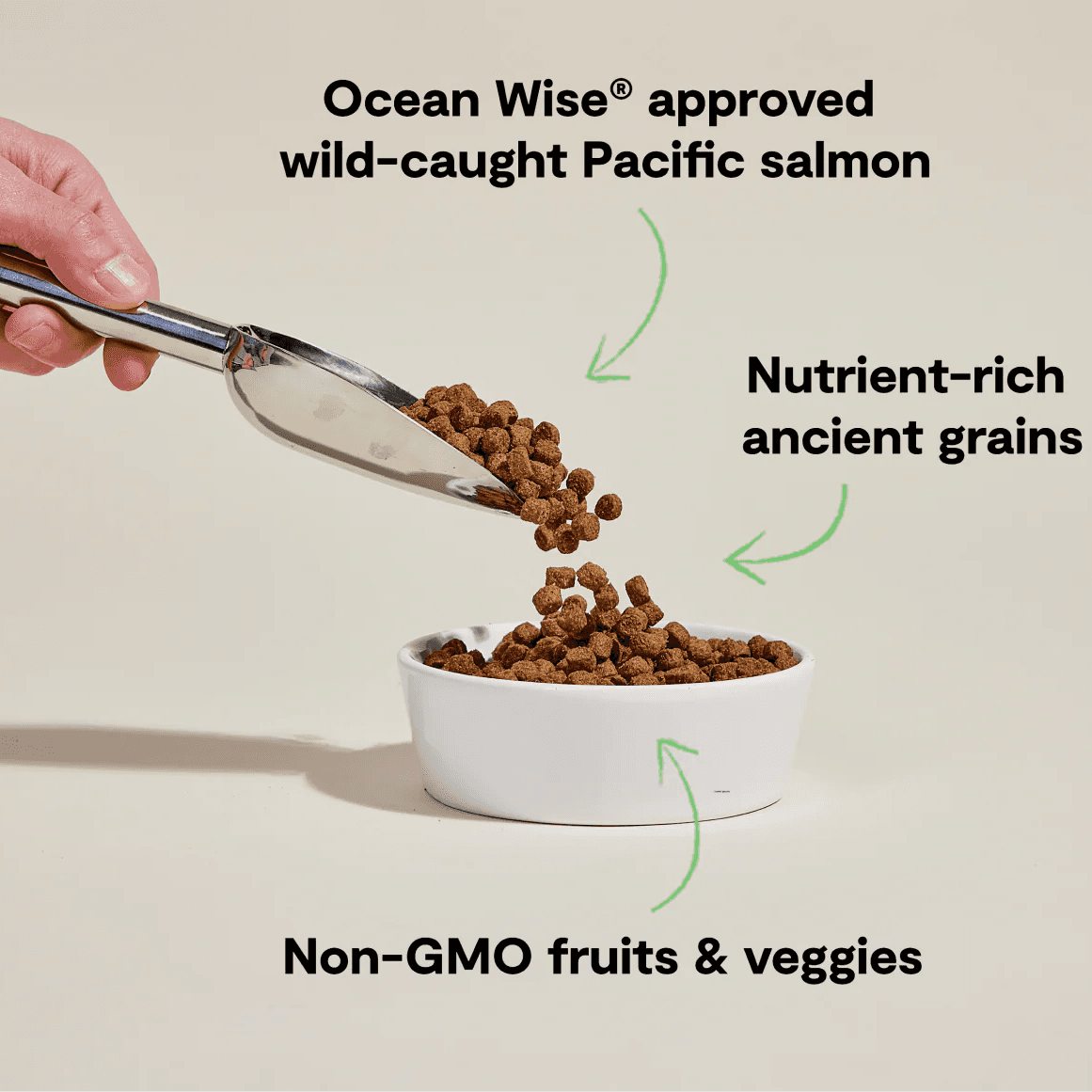 Salmon, Oats, Ocean Whitefish Meal, Sorghum, Quinoa, Coconut Oil , Herring Meal, Natural Flavour , Millet, Pumpkin, Salmon Oil, Apples, Chia Seed, Potassium Chloride, Salt, Chicory Root, Choline Chloride, Vitamin E Supplement, Calcium Pantothenate, Niacin Supplement, Vitamin A Supplement, Riboflavin Supplement, Vitamin D3 Supplement, Vitamin B12 Supplement, Thiamine Mononitrate, Folic Acid, Zinc Proteinate, Calcium Iodate, Taurine, Mixed Tocopherols (a natural preservative), Cinnamon, Turmeric