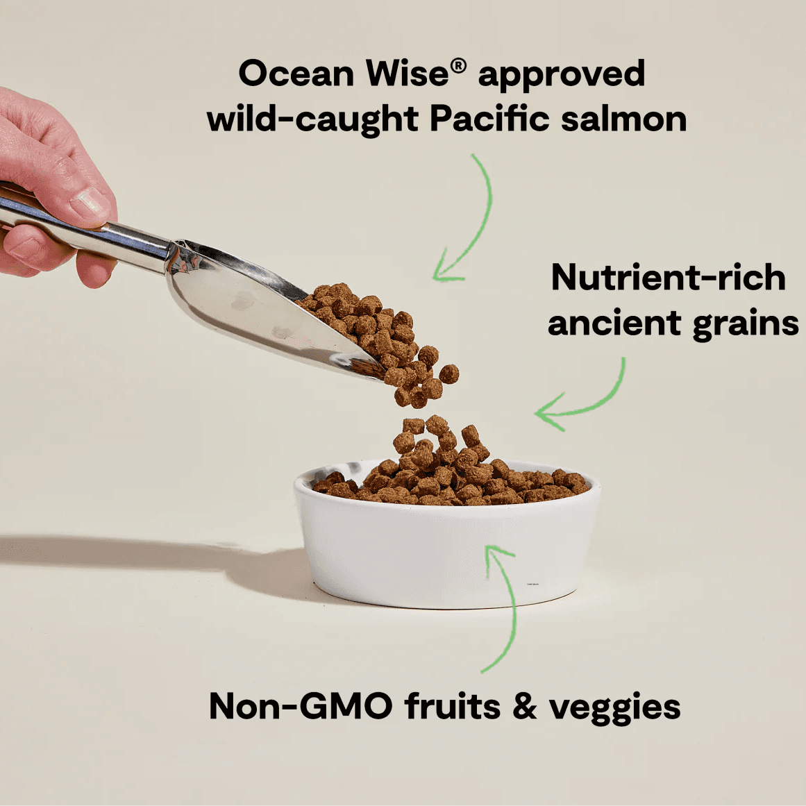 Salmon, Oats, Ocean Whitefish Meal, Sorghum, Quinoa, Coconut Oil , Herring Meal, Natural Flavour , Millet, Pumpkin, Salmon Oil, Apples, Chia Seed, Potassium Chloride, Salt, Chicory Root, Choline Chloride, Vitamin E Supplement, Calcium Pantothenate, Niacin Supplement, Vitamin A Supplement, Riboflavin Supplement, Vitamin D3 Supplement, Vitamin B12 Supplement, Thiamine Mononitrate, Folic Acid, Zinc Proteinate, Calcium Iodate, Taurine, Mixed Tocopherols (A Natural Preservative), Cinnamon, Turmeric