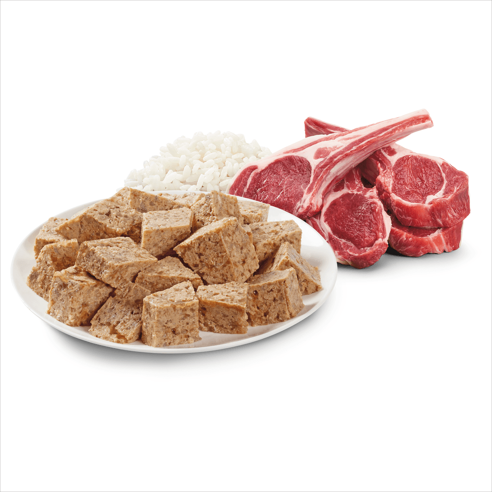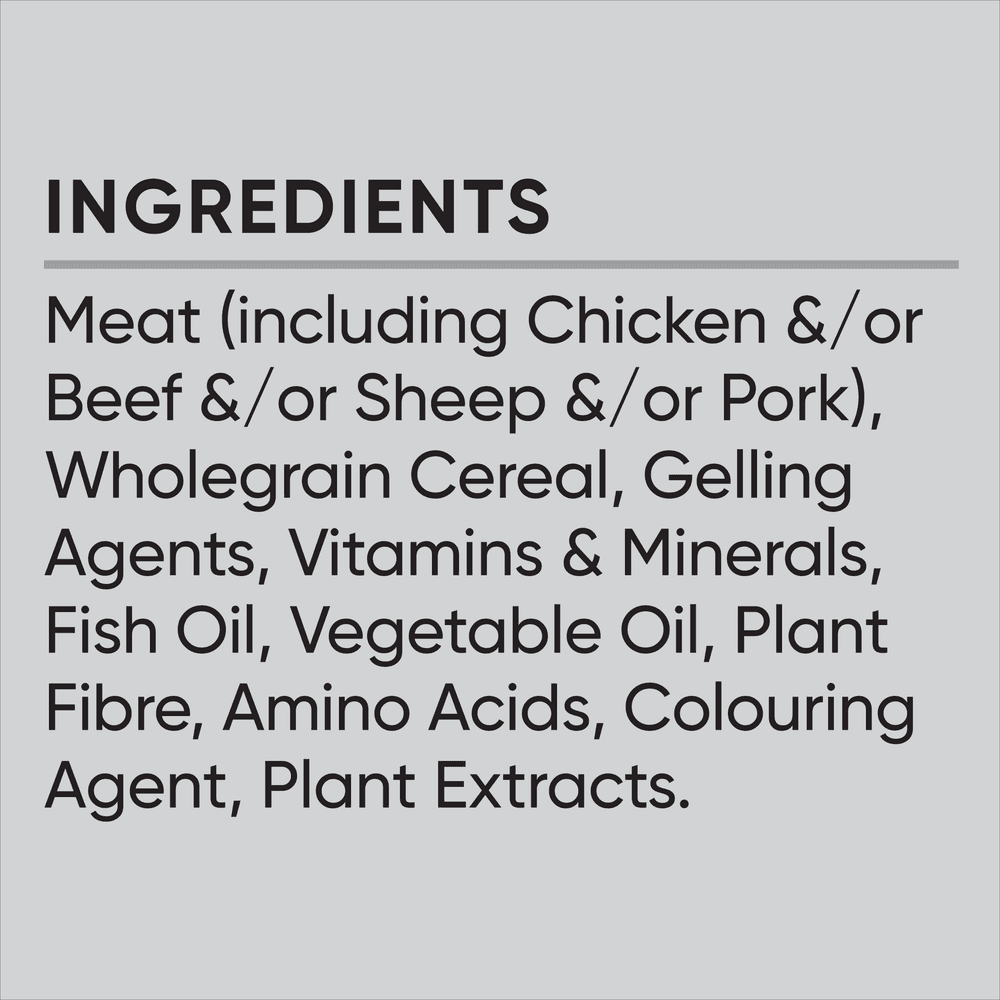 Meat (chicken, lamb &/or sheep, beef &/or pork &/or turkey); rice; gelling agents; vegetable oil; vegetable fibre; amino acids; vitamins & minerals; colouring agent; natural flavour (including garlic); plant extracts (contain natural antioxidants).