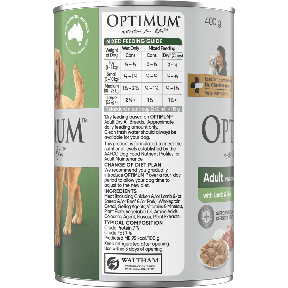 Optimum Adult Lamb Rice Dog Food provide a nutritionally complete and balanced wet meal designed specifically to support the health and vitality of adult dogs. Proudly Australian made, this premium recipe features lamb as a high quality protein source to assist in maintaining lean muscle and overall well being in every life stage.