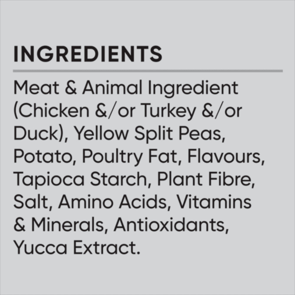 Meat & meat by products (chicken &/or turkey &/or duck); vegetables; palatants; tapioca starch; salt; plant fibres; vitamins & minerals; antioxidants; amino acids; yucca extract.