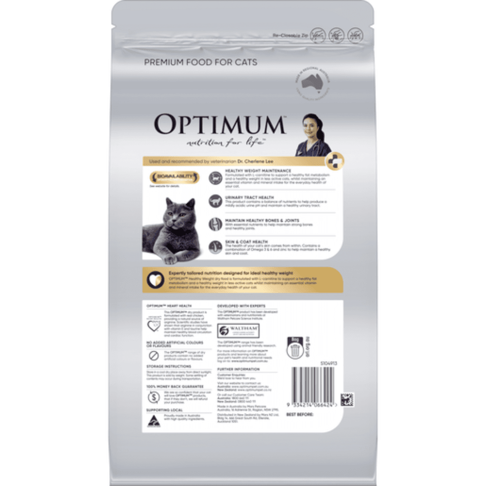 Optimum Dry Cat Food Healthy Weight Chicken provides a complete and balanced diet specifically formulated to help less active adult cats maintain an ideal body condition. This formula uses L-carnitine to support healthy fat metabolism while ensuring your cat receives essential nutrients.