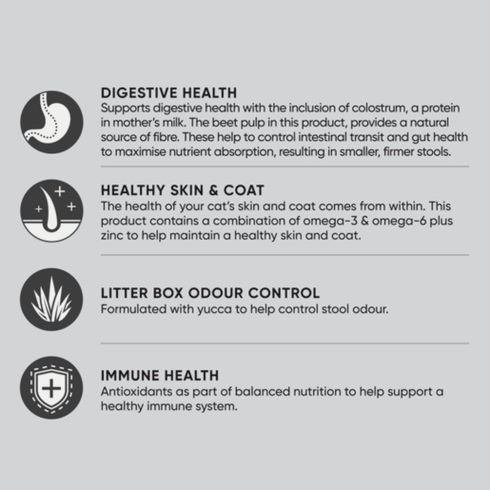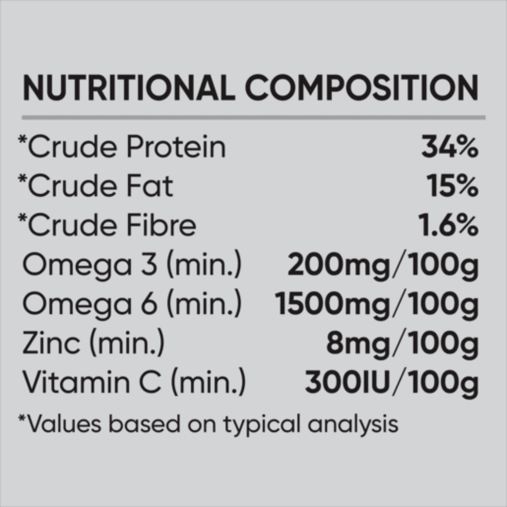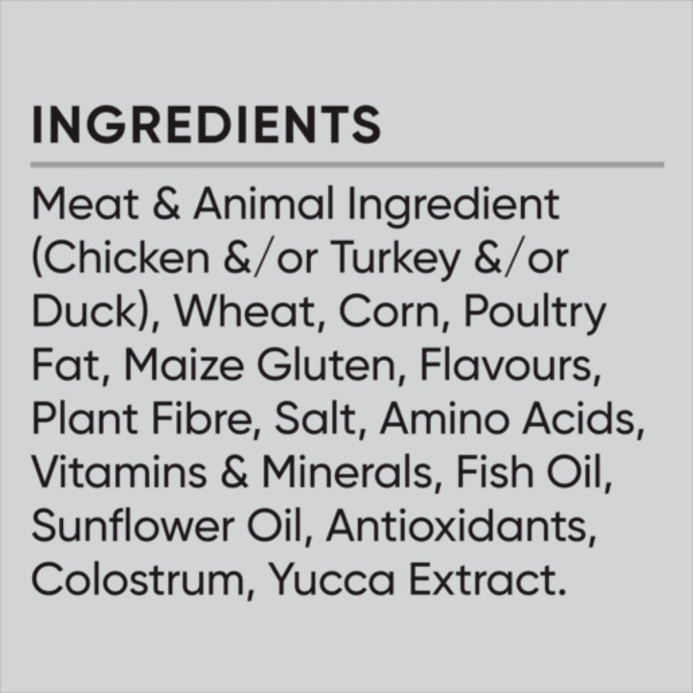 Meat & Animal Ingredient (Chicken &/or Turkey &/or Duck), Wheat, Corn, Poultry Fat, Maize Gluten, Flavours, Plant Fibre, Salt, Amino Acids, Vitamins & Minerals, Fish Oil, Sunflower Oil, Antioxidants, Colostrum, Yucca Extract.