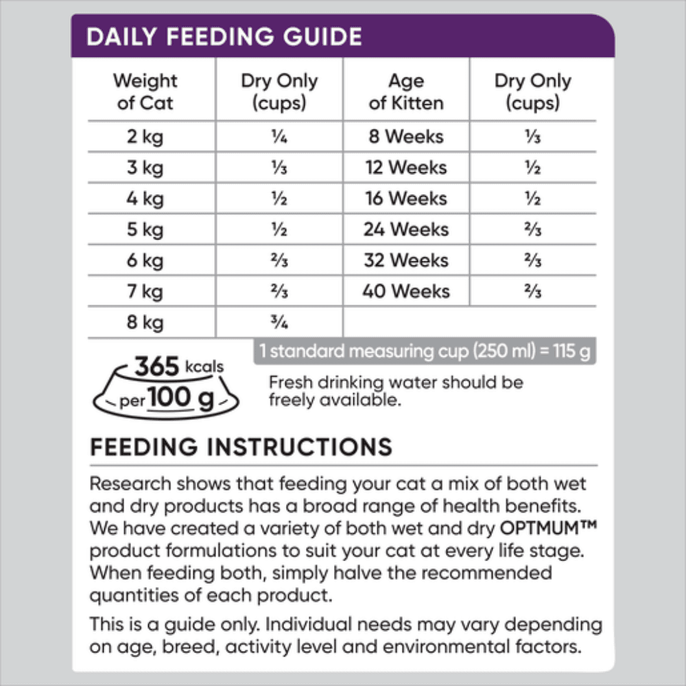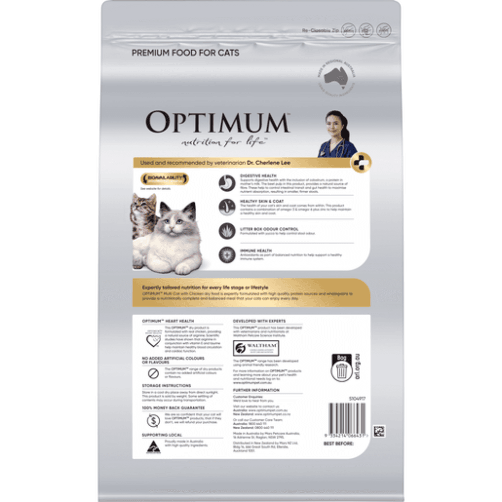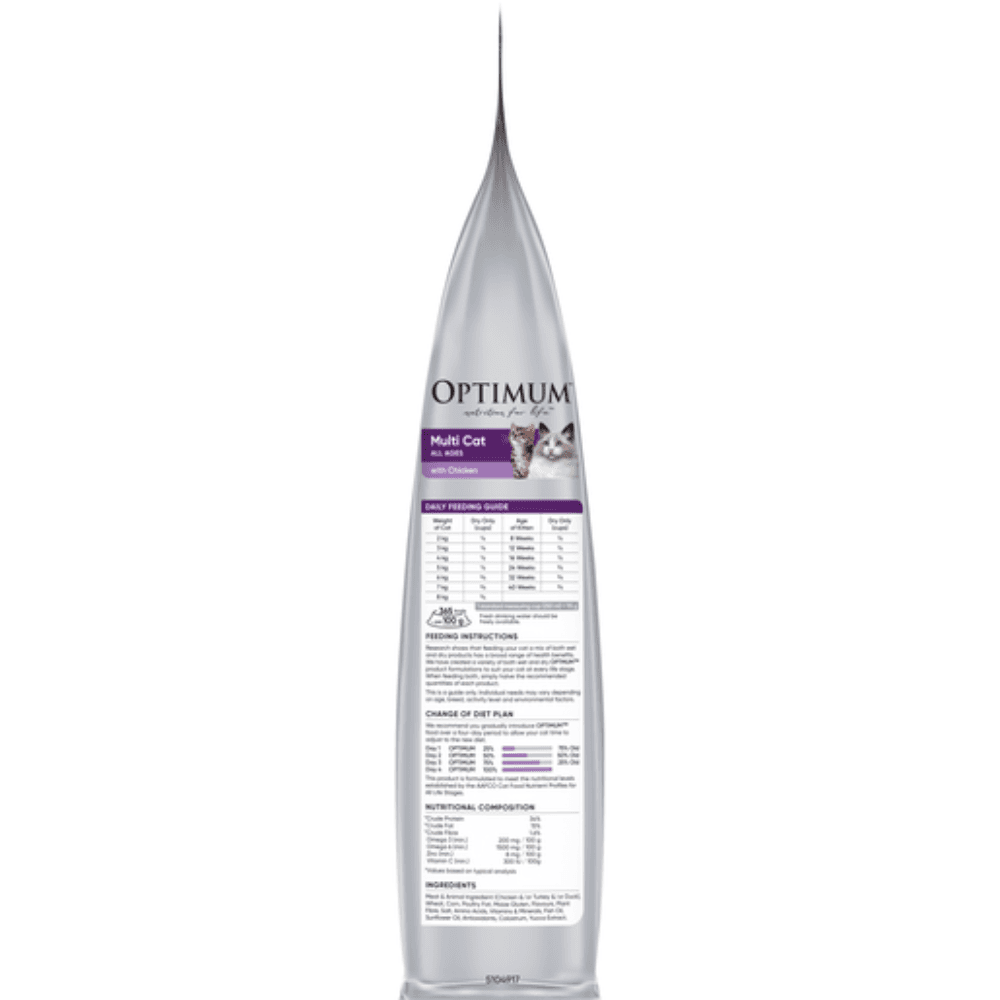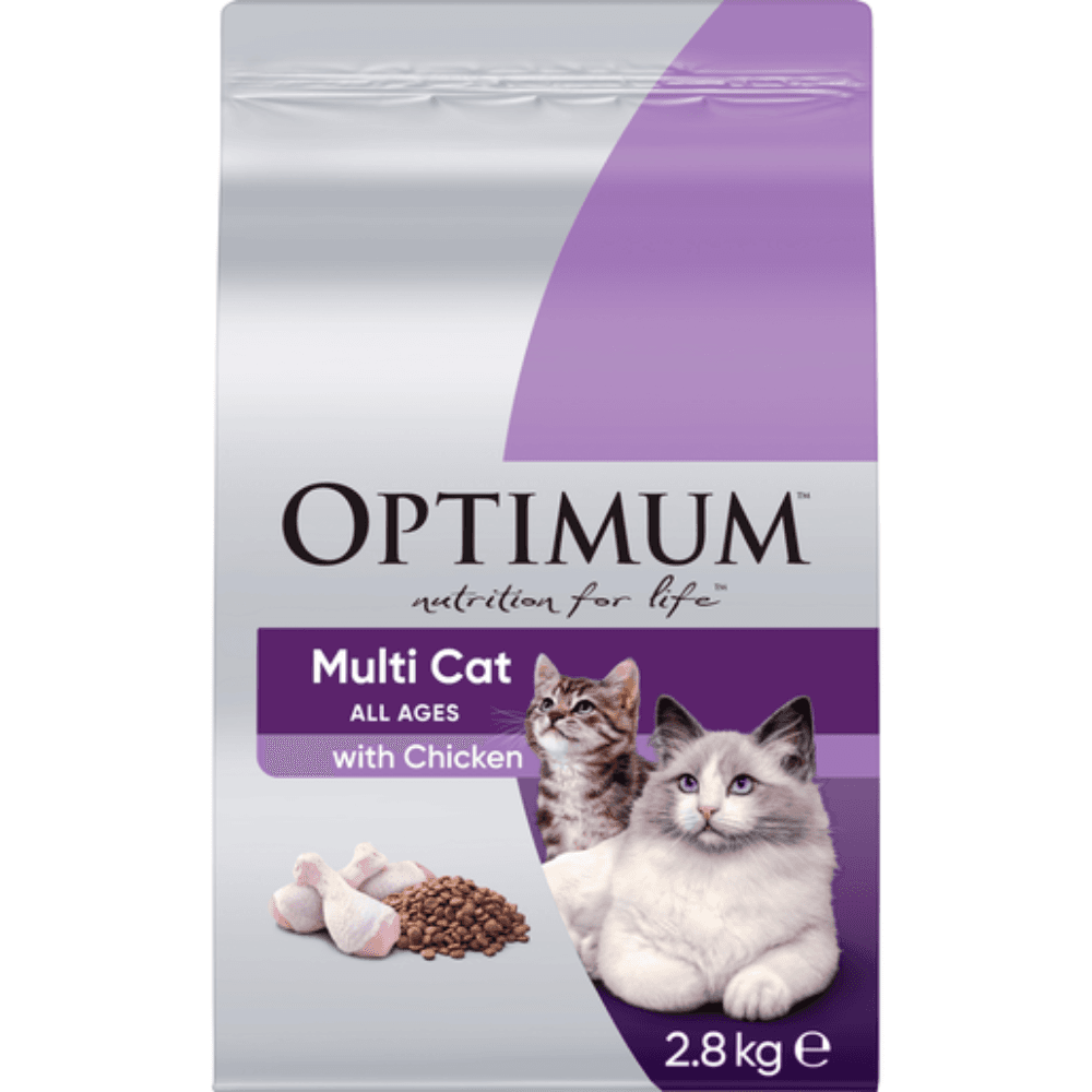 The Optimum Dry Cat Food Multi Cat Chicken provides a complete and balanced nutritional solution specifically formulated for households with multiple cats. This recipe uses high-quality chicken and wholegrains to ensure high nutrient absorption and support overall health across different life stages.