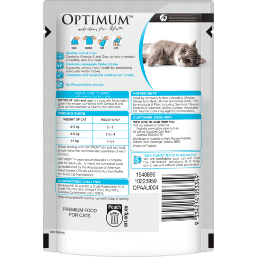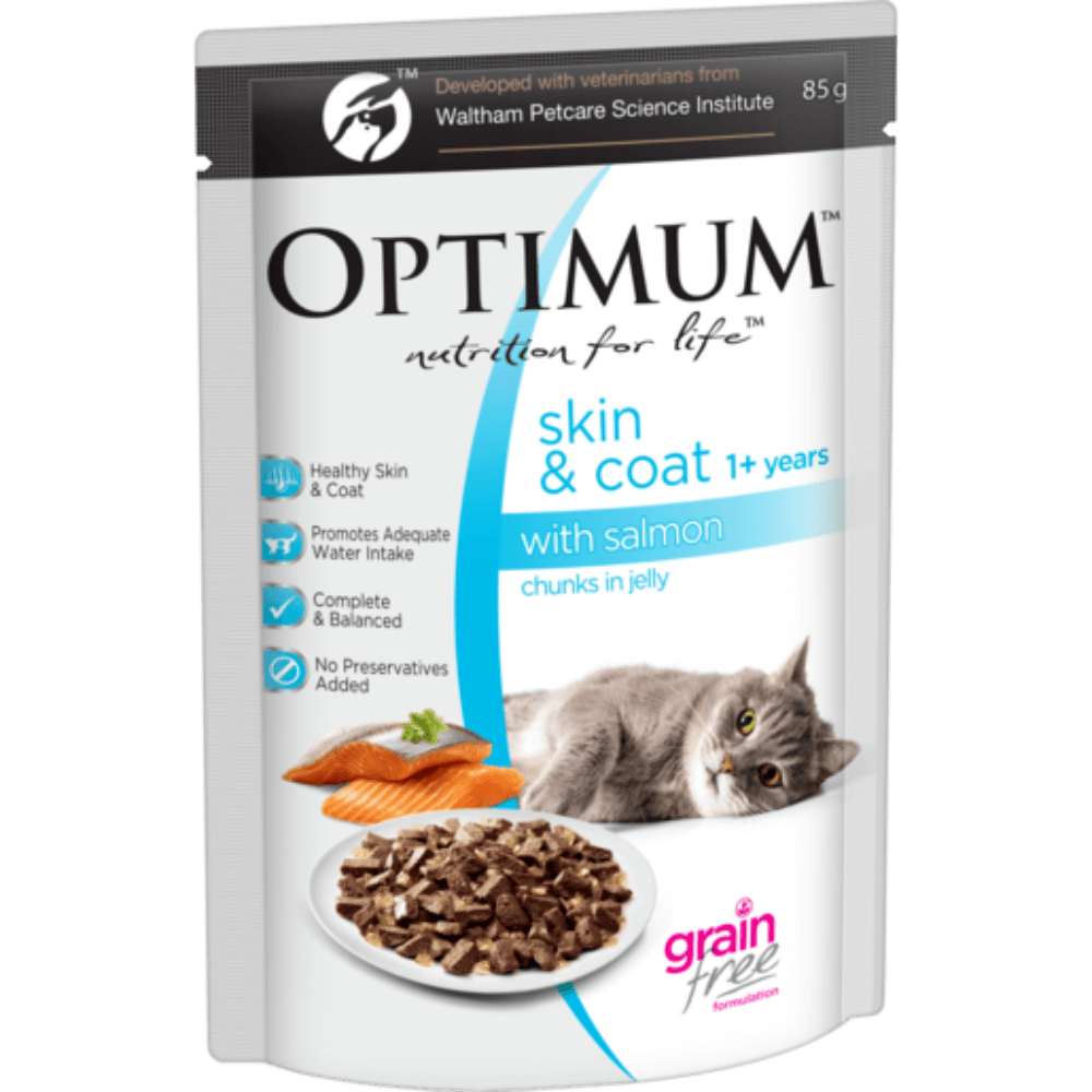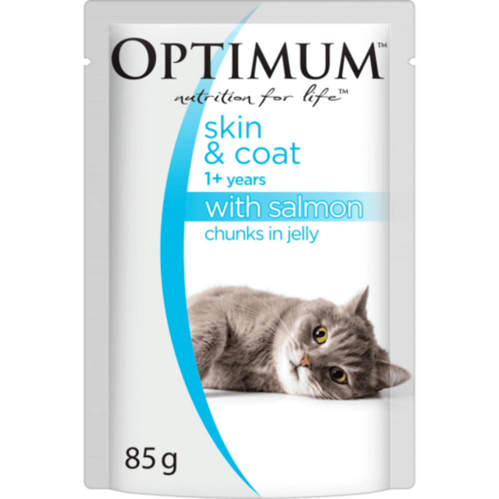 Delight your cat with the Optimum Grain Free Skin and Coat Wet Cat Food, featuring savory salmon in a succulent jelly. This premium meal is specifically crafted to alleviate and prevent skin discomfort while promoting a lustrous coat.