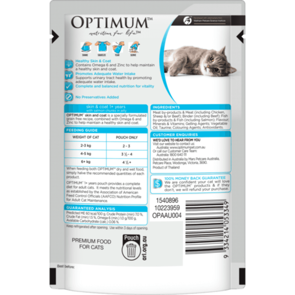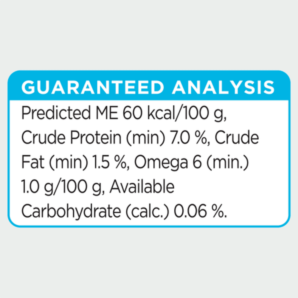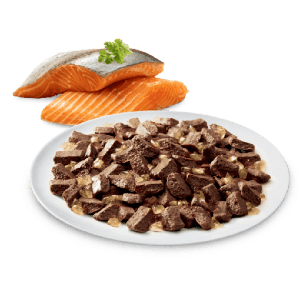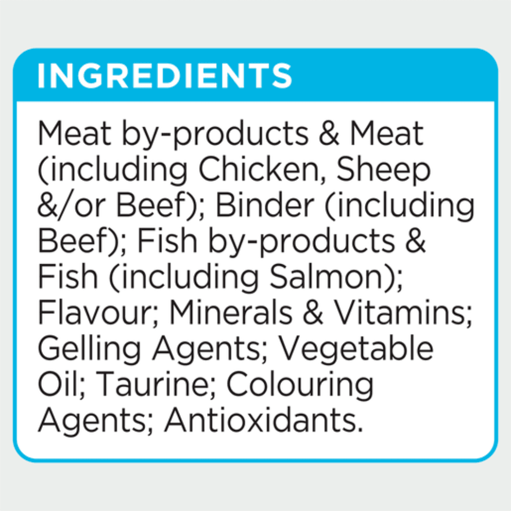 Meat by-products and Meat (including Chicken, Sheep &/or Beef); Fish by-products and Fish (including Salmon); Binder (including Beef &/or Sheep); Flavour; Gelling Agents; Minerals & Vitamins; Vegetable Oil; Colouring Agents; Taurine; Antioxidants.
