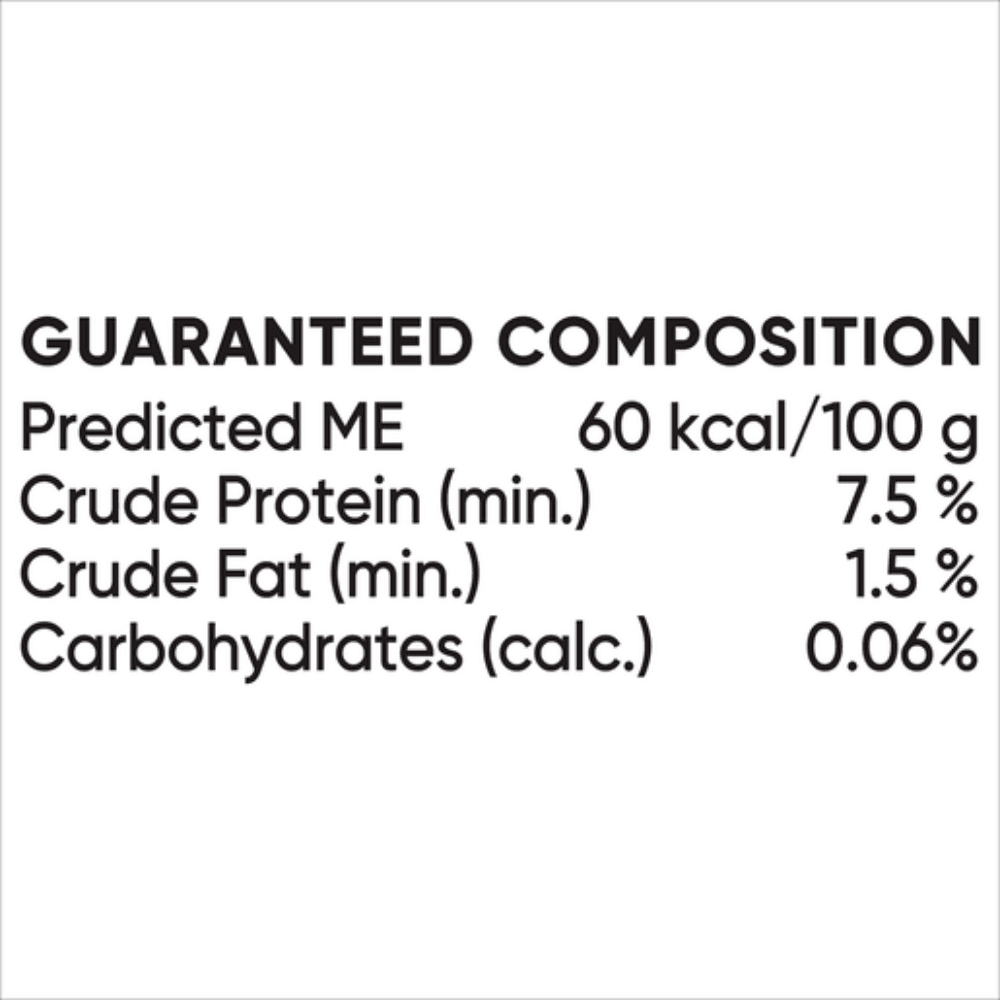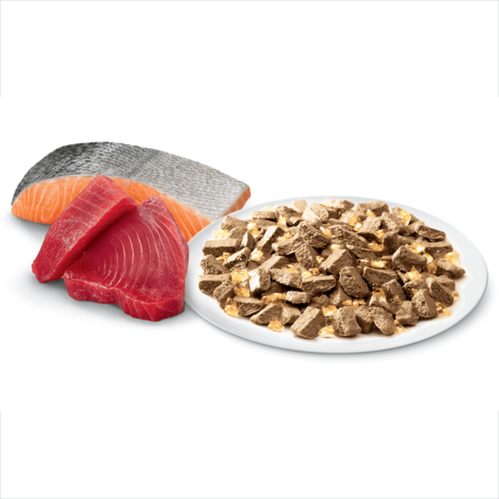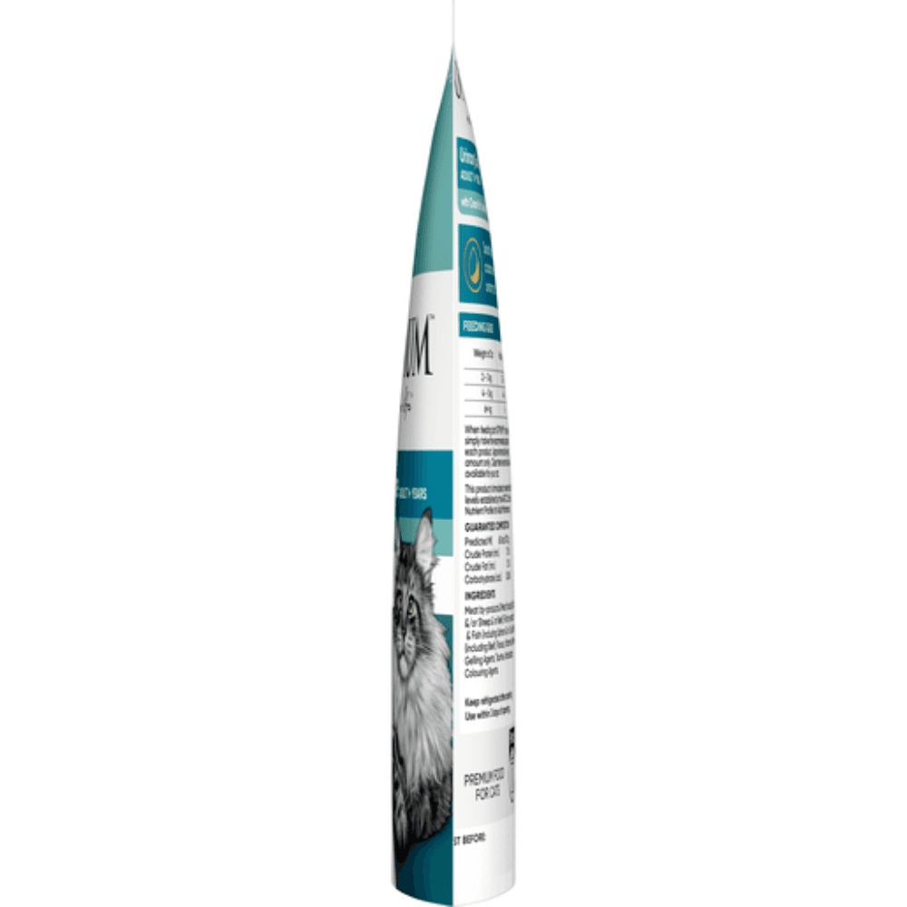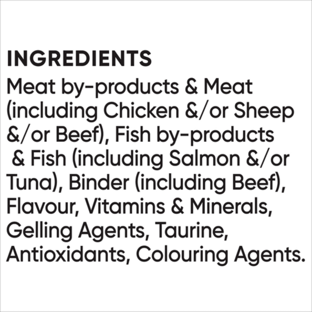 Meat by-products and Meat (including Chicken, Sheep &/or Beef); Fish by-products and Fish (including Salmon); Binder (including Beef &/or Sheep); Flavour; Gelling Agents; Minerals & Vitamins; Vegetable Oil; Colouring Agents; Taurine; Antioxidants.