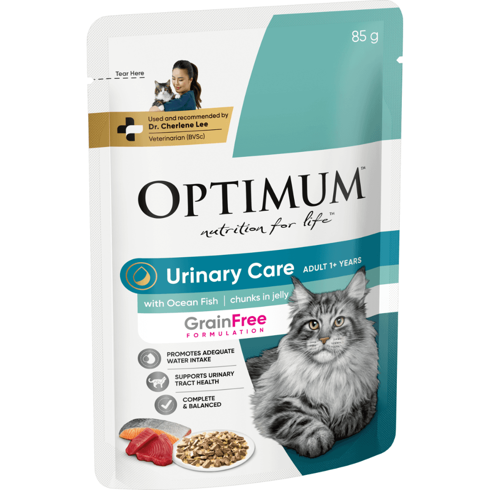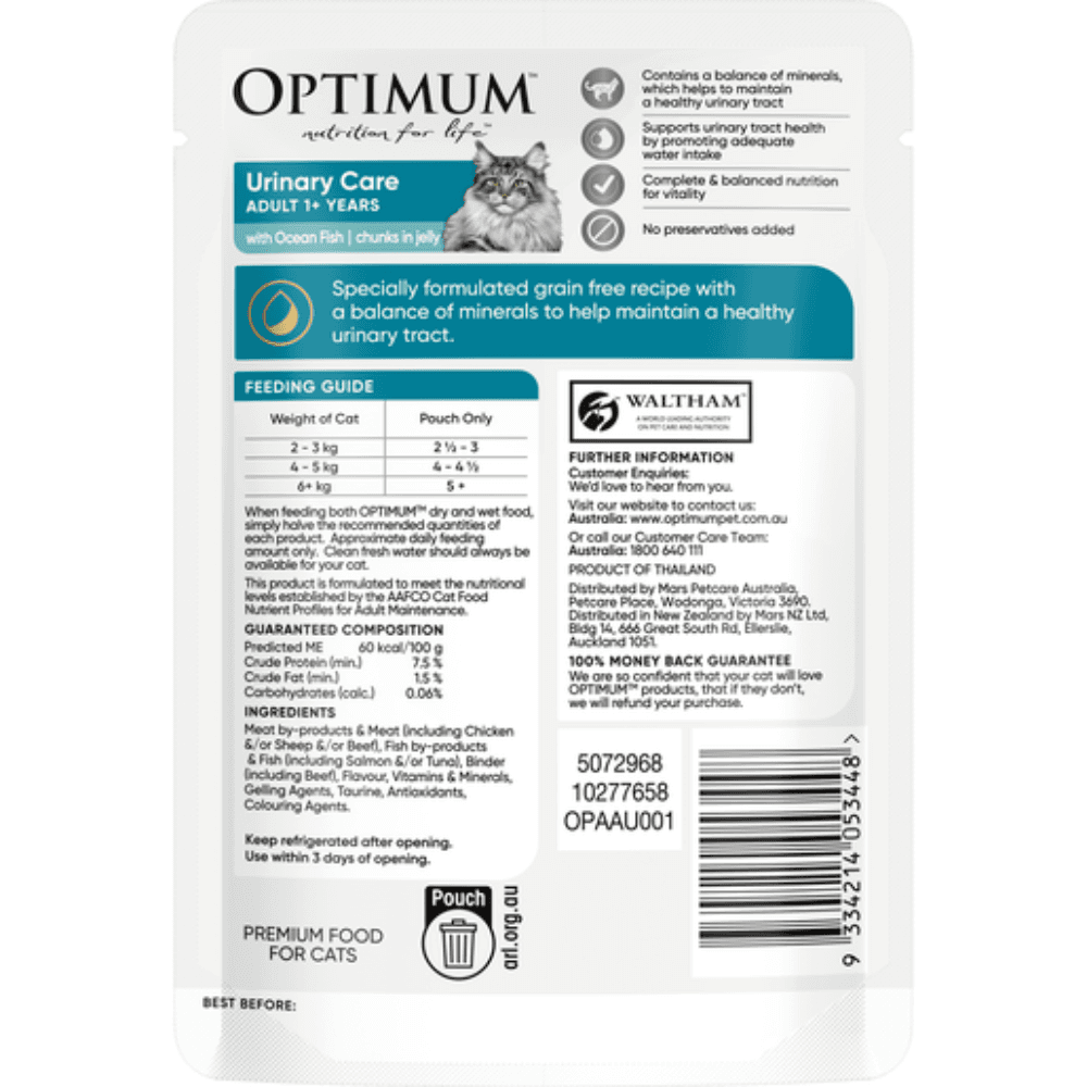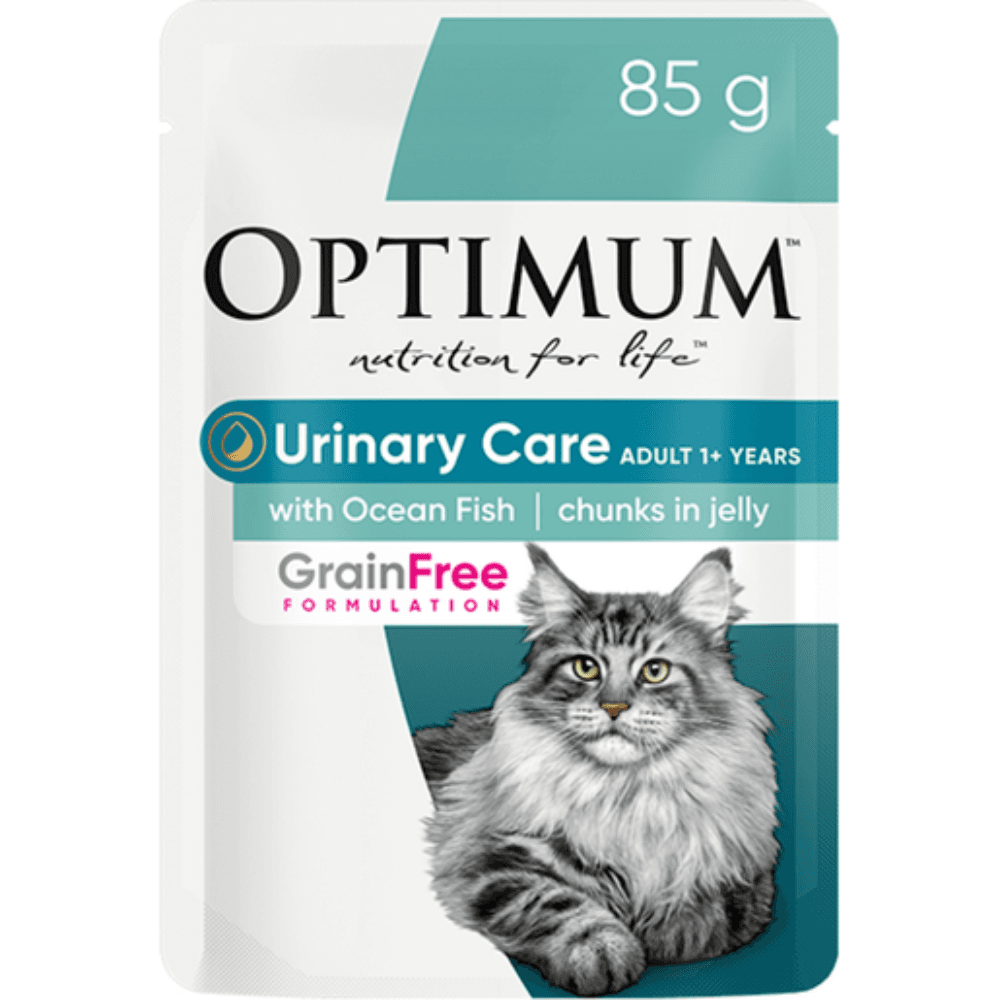 Crafted for feline companions with urinary health concerns, this scrumptious Optimum Grain Free Urinary Care wet food comes in delectable ocean fish chunks enveloped in savory jelly to please your cats palate.