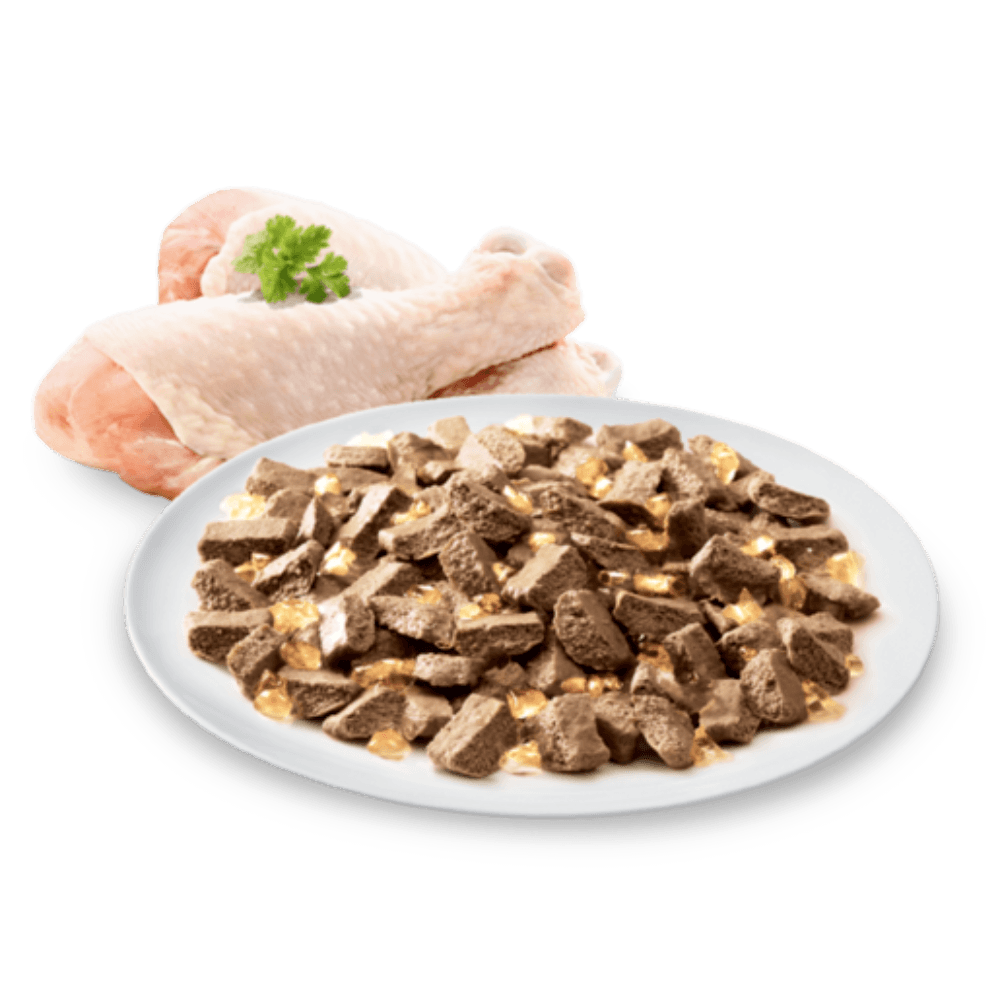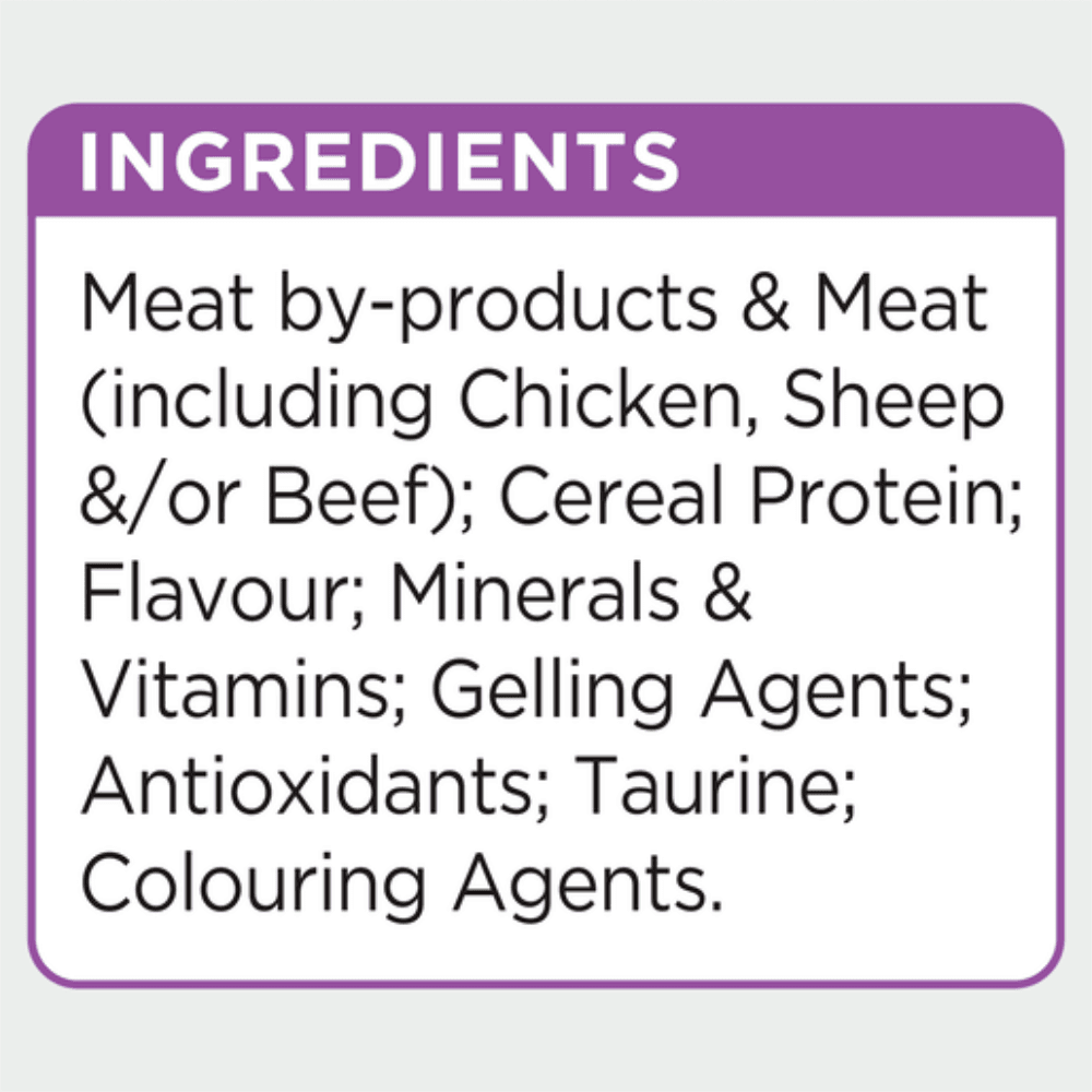 Meat by-products & Meat (including Chicken, Sheep &/or Beef); Cereal Protein; Flavour; Plant Fibre; Minerals & Vitamins; Gelling Agents; Vegetable Oil; Taurine; Antioxidants; Colouring Agents.