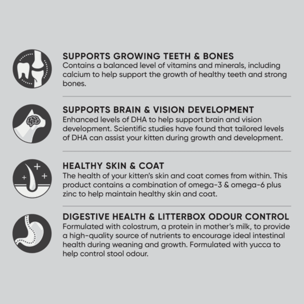 Poultry and poultry by-products, cereals, cereal protein, tuna meal, poultry digest, salt, beet pulp, minerals (potassium chloride, calcium carbonate, zinc sulphate, ferrous sulphate, copper sulphate, potassium iodide), vitamins (A, B1, B2, B3, B6, B9, B12, C, D3, E and choline), sunflower oil, taurine, methionine, colostrum, antioxidants, marigold meal, inulin and yucca. Crude Protein 38.0% ; Crude Fat 18.0%; Taurine 0.4%; Calcium 1.5%; DHA 0.1%; Omega 6 2.0%; Omega 3 0.2%; Vitamin E 500 IU/kg; Vitamin C 400 mg/kg