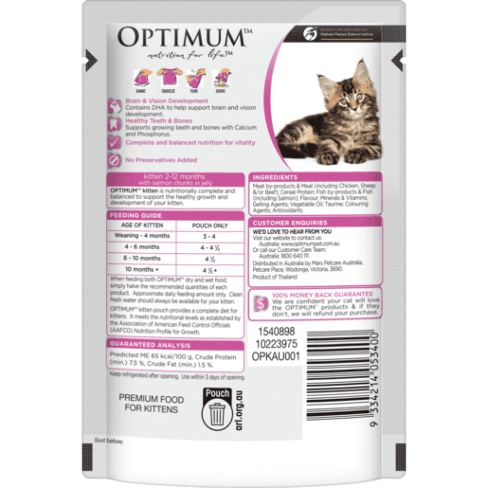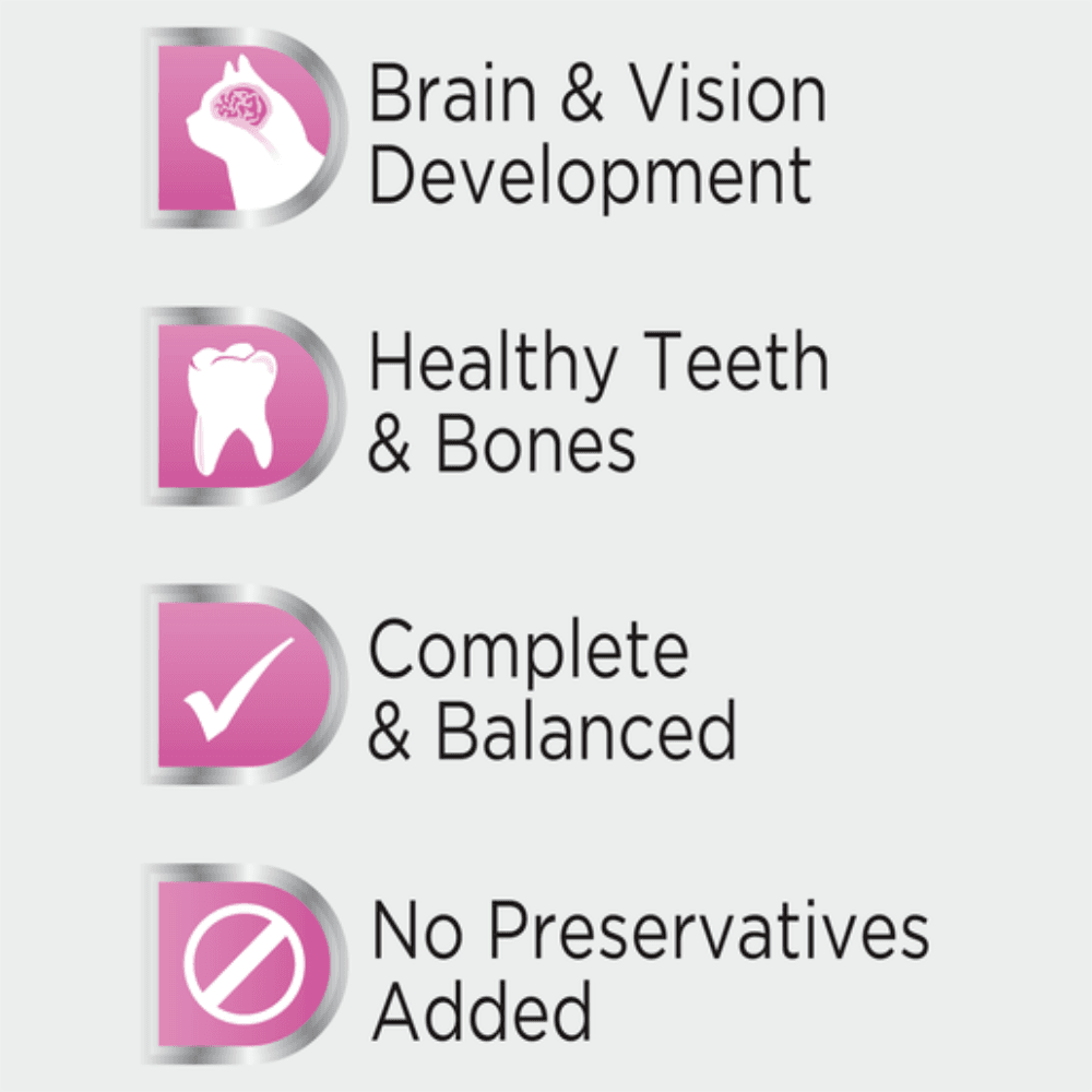 Meat by-products & Meat (including Chicken, Sheep &/or Beef); Binder (including Beef); Cereal Protein, Fish by-products & Fish (including Salmon); Flavour; Minerals & Vitamins; Gelling Agents; Vegetable Oil; Taurine; Colouring Agents; Antioxidants.
