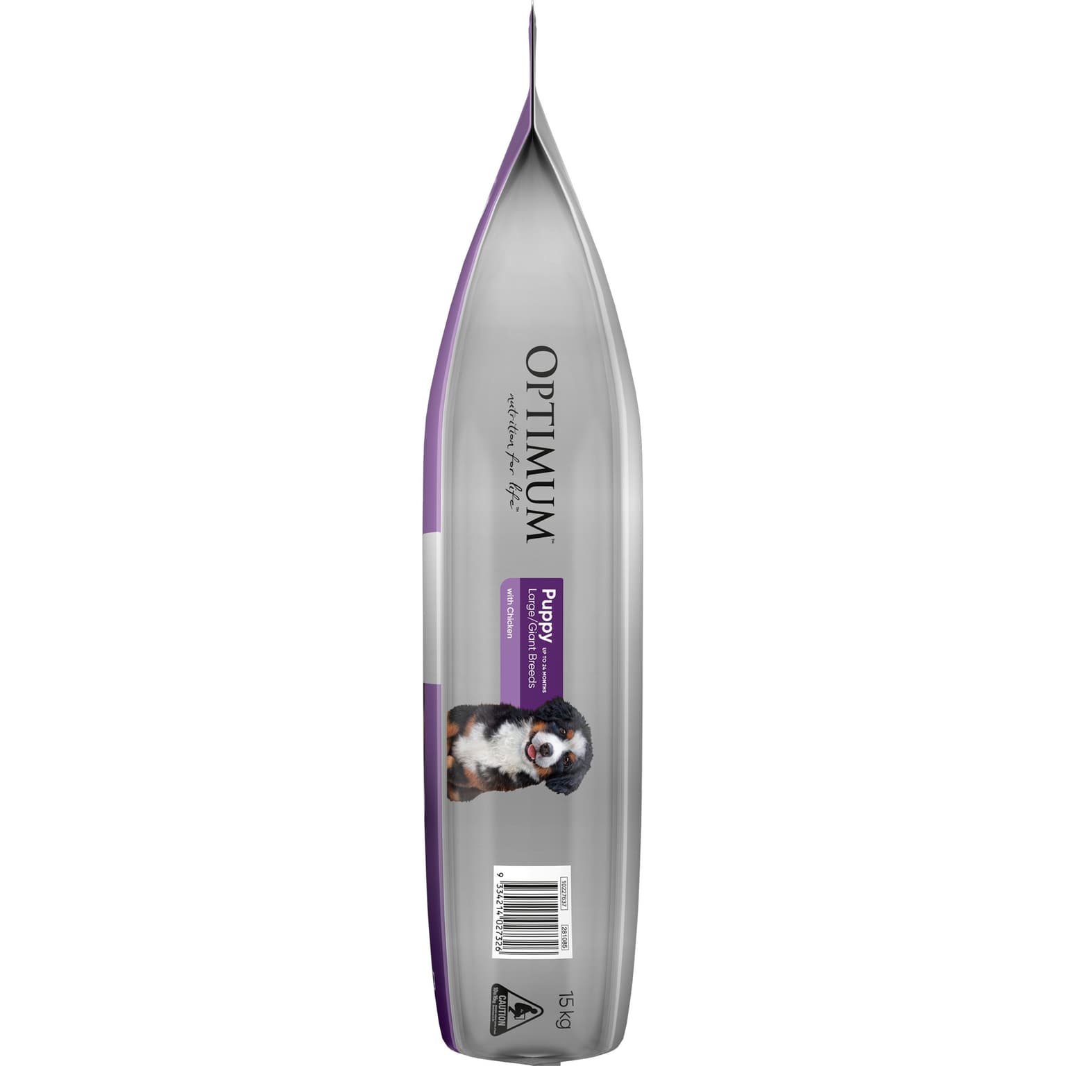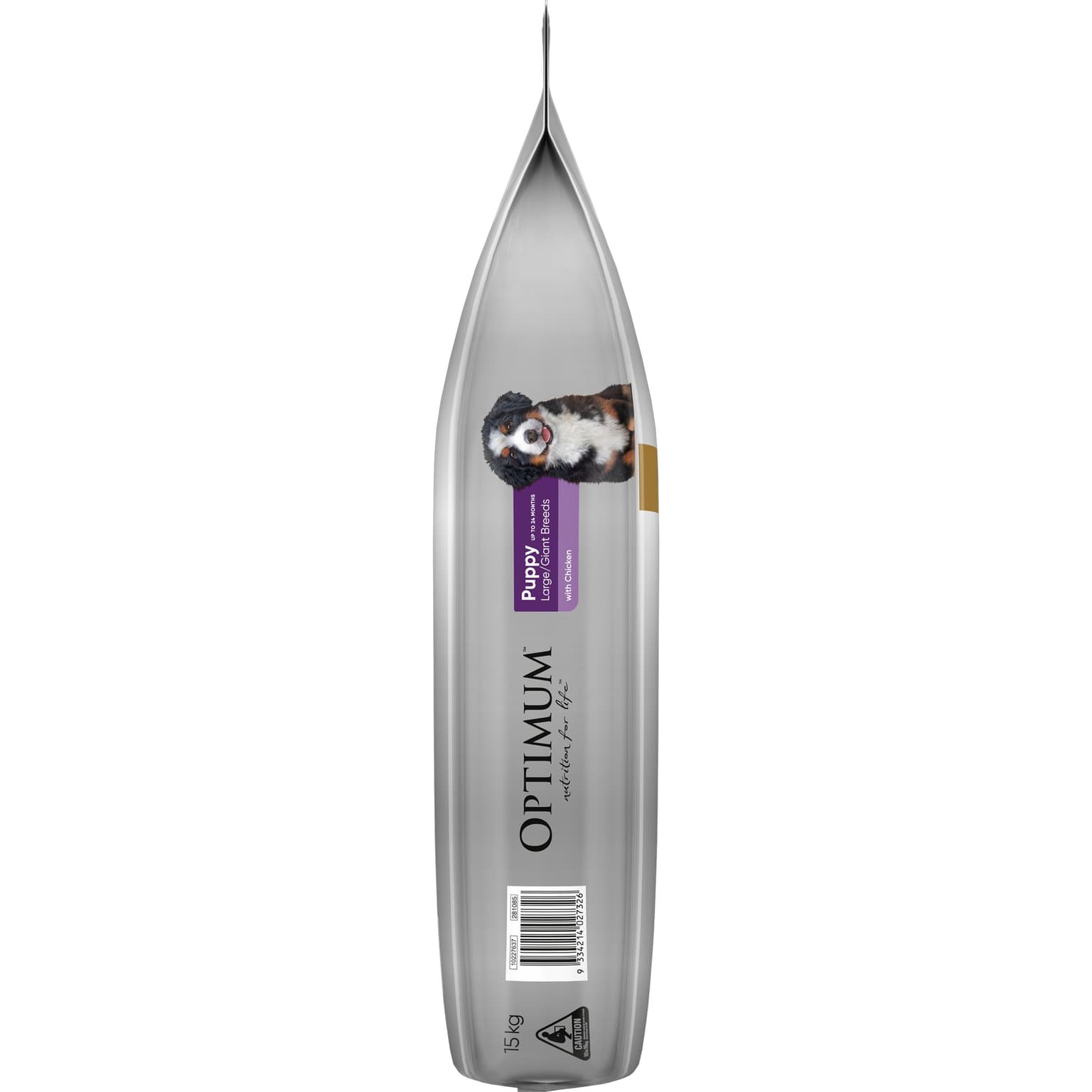 Optimum Puppy Large Breed with Chicken Optimum pet food is made in Australia and contains no artificial colours or flavours. Optimum Puppy Large Breed with Chicken is a dry food formulated for large breed puppies up to 24 months of age. Large breed puppies require optimal levels of calcium, calories, and other nutrients in order to support such an accelerated level of growth. This diet contains a complete balanced mix of nutrients, plus protein and energy to completely support the growth and wellbeing of your large breed puppy.