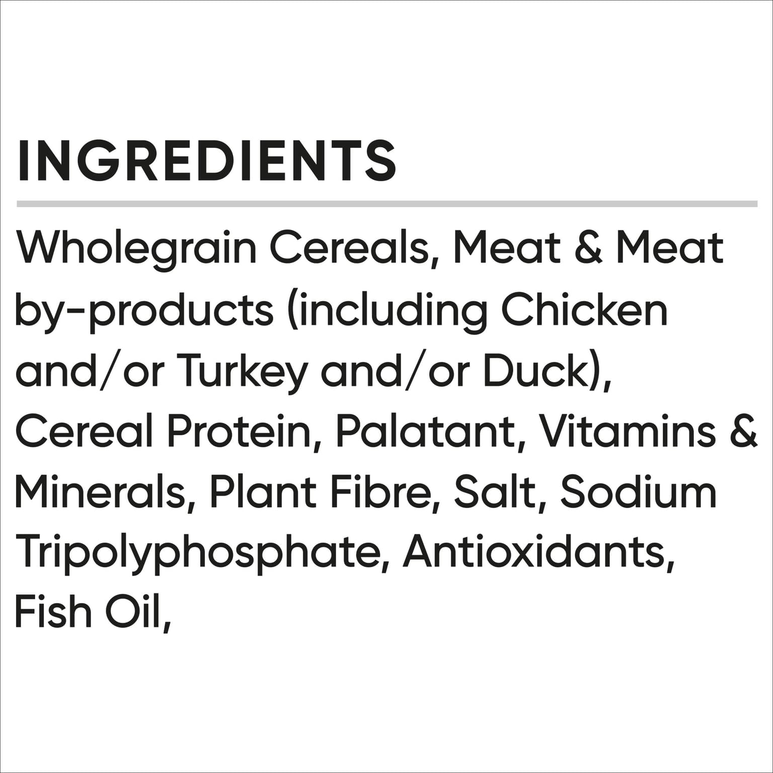 Wholegrain Cereals, Meat & Meat By-Products (Including Chicken And/Or Turkey And/Or Duck), Cereal Protein, Palatant, Vitamins & Minerals, Plant Fibre, Salt, Sodium Tripolyphosphate, Antioxidants, Fish Oil