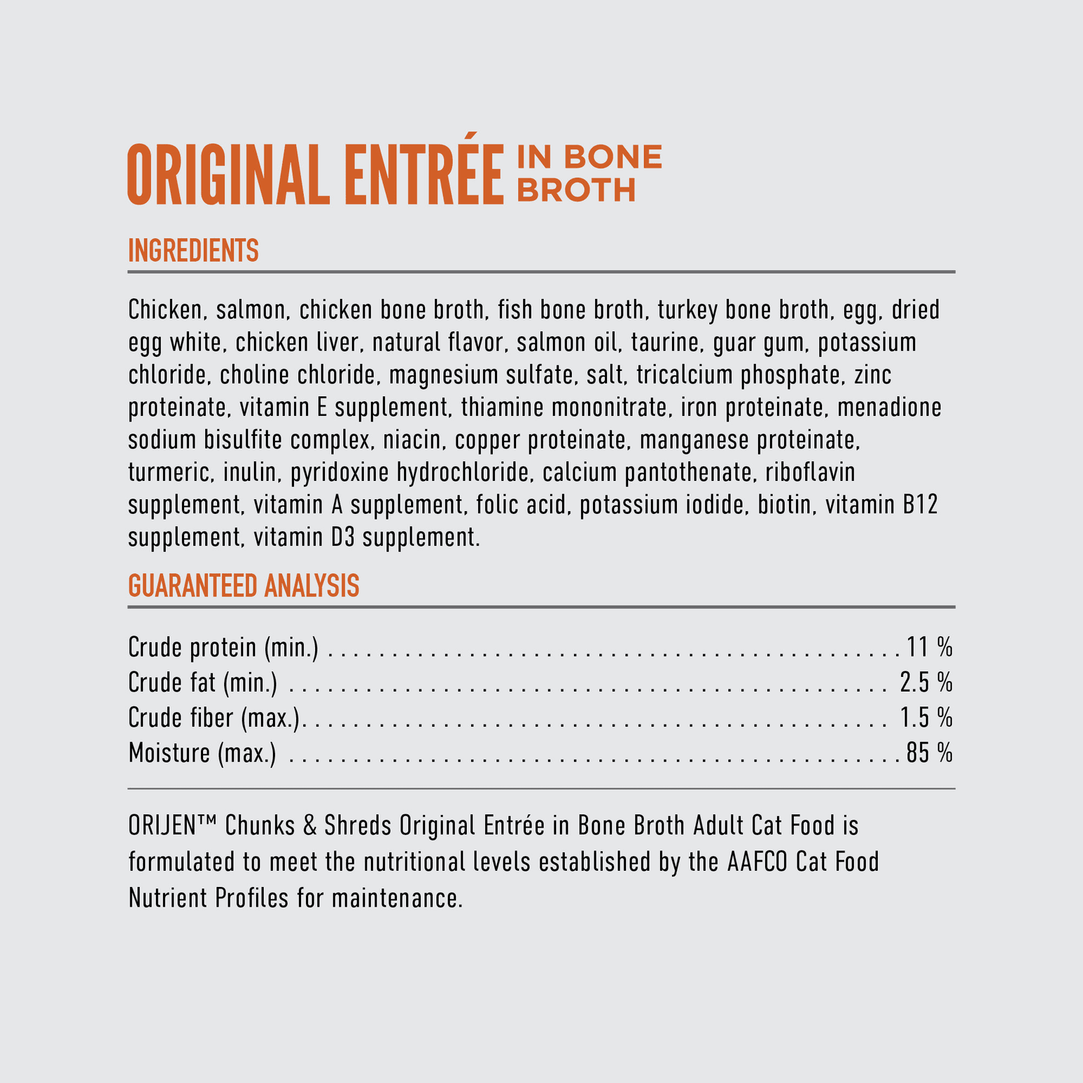 ORIJEN Chunks and Shreds Original Wet Cat Food nourishes your cat with a delicious, protein-packed meal of chicken and salmon. Its hearty texture of real meat chunks and shreds in a savoury bone broth is designed to satisfy their natural carnivorous diet.