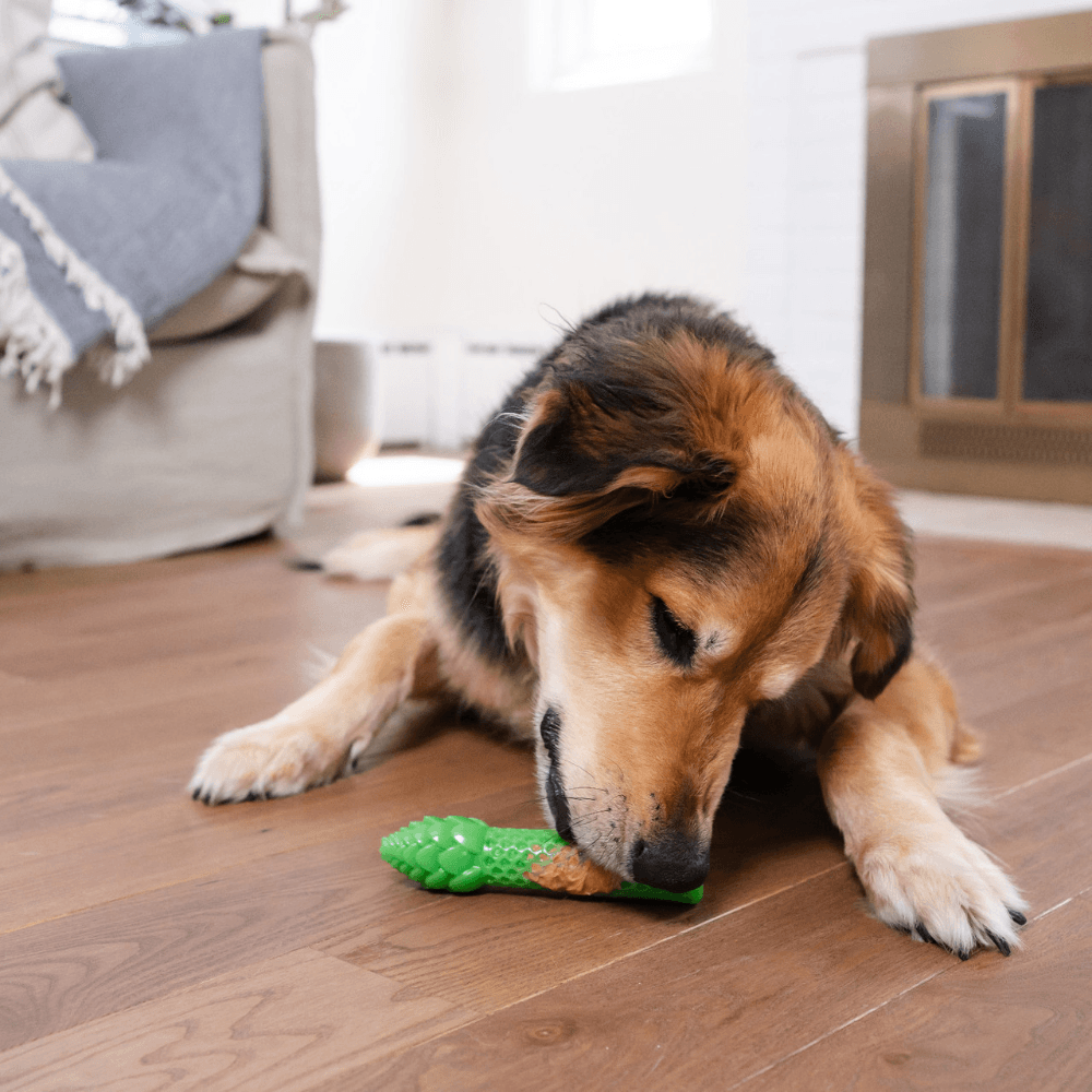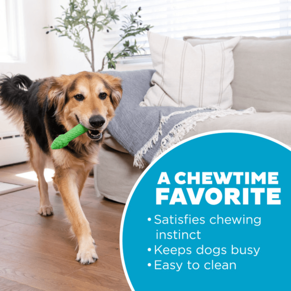 Play, chew, and help clean teeth! The Outward Hound Dental Asparagus Treat-Dispensing Dental Dog Chew Toy is a versatile 2-in-1 dental dog chew toy and treat dispenser that is both durable and gentle on your dog's teeth. Medium size and designed for dogs small, medium, large and all breeds, this green chew toy can be stuffed with your dog's favorite treats or smears like peanut butter to create an interactive and mentally stimulating playtime experience that teaches your dog to problem-solve while they play. The ridges and grooves help clean teeth as dogs chew, and the fun texture keeps them engaged while providing a sensory element to chew time. Stick-shaped for playing fetch or rolling to release the dog treats, the Dental Asparagus is also easy for your dog to hold with its paws for optimal chewing. This versatile toy is mint-scented to help freshen breath and is also BPA, lead, and phthalate-free, ensuring your pet's safety and your peace of mind. Easy to clean and designed to satisfy your dog's chewing instincts, Outward Hound's Dental Asparagus is the perfect boredom buster to provide long-lasting entertainment for your best fur friend.