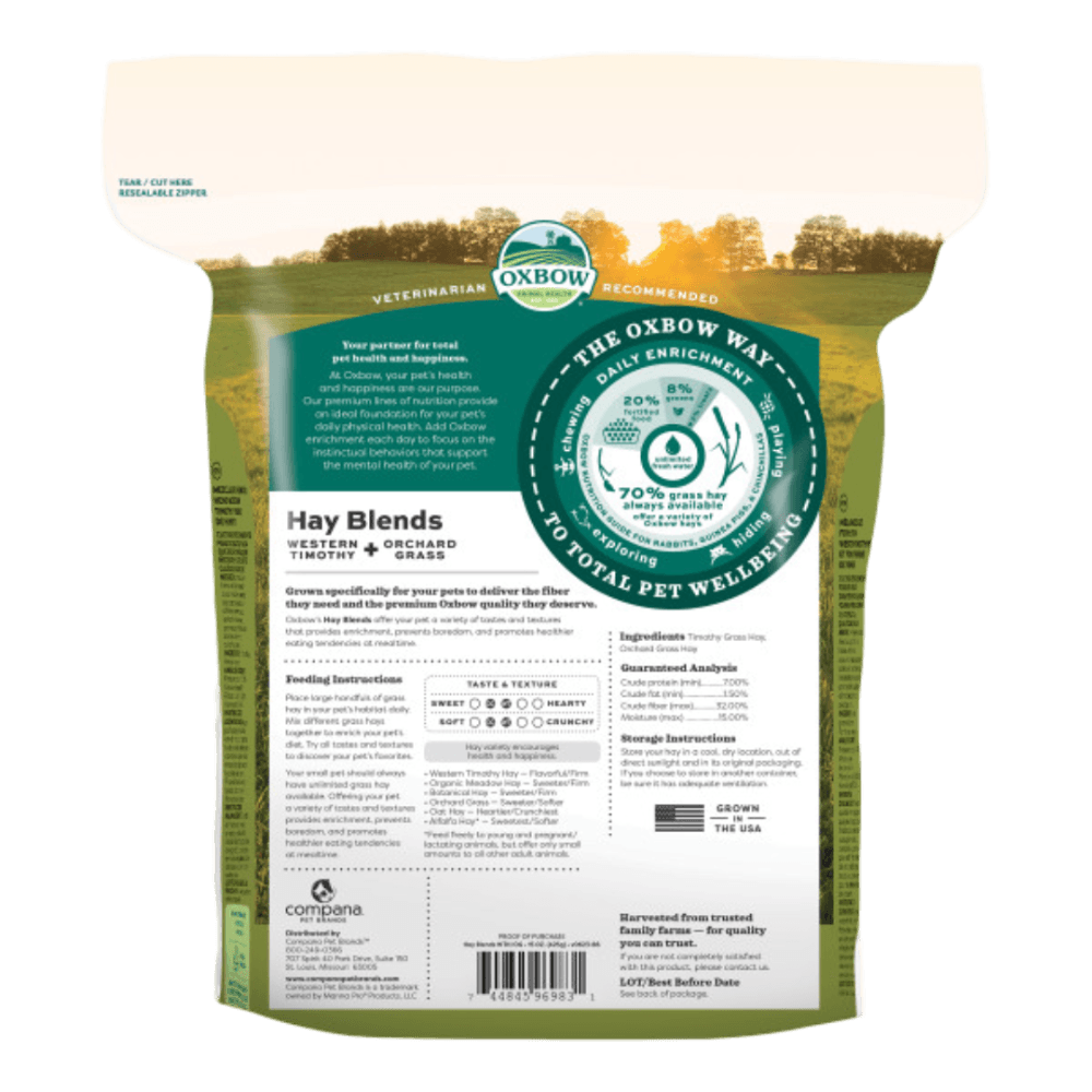 Offer your small pet a delicious and enriching dietary variety with Oxbow Hay Blends Western Timothy and Orchard Hay. This convenient blend combines two of Oxbow's most popular, high-fibre hays, harvested fresh from their family of farms and specifically grown to support the digestive and dental health of small pets.