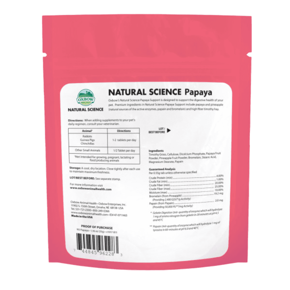 Provide your small pet with natural digestive support through Oxbow Natural Science Papaya Support, a high-fibre supplement designed to aid overall gastrointestinal health. This highly palatable formula combines premium Timothy hay with the beneficial properties of papaya and pineapple to assist your pet's digestion.