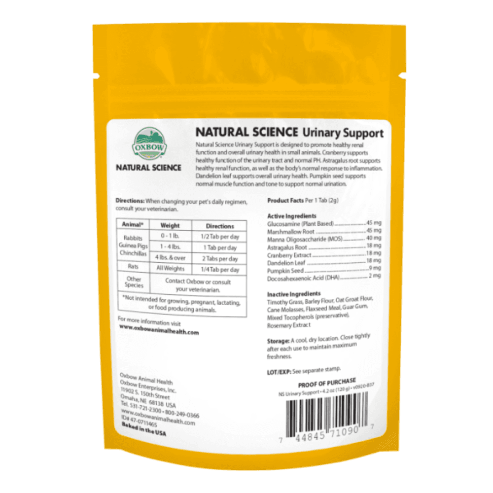 Product Facts Per 1 Tab (2g) Active Ingredients: Glucosamine (Plant Based): 45 mg, Marshmallow Root: 45 mg, Manna Oligosaccharide (MOS): 40 mg, Astragalus Root: 18 mg, Cranberry Extract: 18 mg, Dandelion Leaf: 18 mg, Pumpkin Seed: 9 mg, Docosahexaenoic Acid (DHA), 2 mg Inactive Ingredients: Timothy Grass, Barley Flour, Oat Groat Flour, Cane Molasses, Flax Seed Meal, Guar Gum, Mixed Tocopherols (preservative), Rosemary Extract