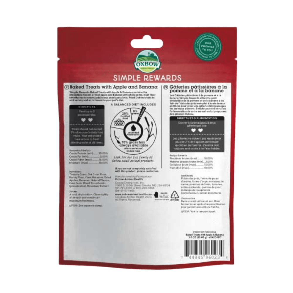 Spoil your little mate with Oxbow Simple Rewards! These all-natural, high-fibre treats support digestive health while offering a delicious apple and banana flavour. Oxbow prioritises natural ingredients for your pet's well-being.