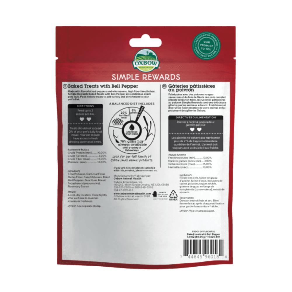 Offer your small pet a delicious and zesty reward with Oxbow Simple Rewards Baked Treats with Bell Pepper. These wholesome, oven-baked treats are crafted with flavourful red bell peppers and high-fibre Timothy hay, providing an irresistible snack that adds variety and enrichment to your pet's diet.
